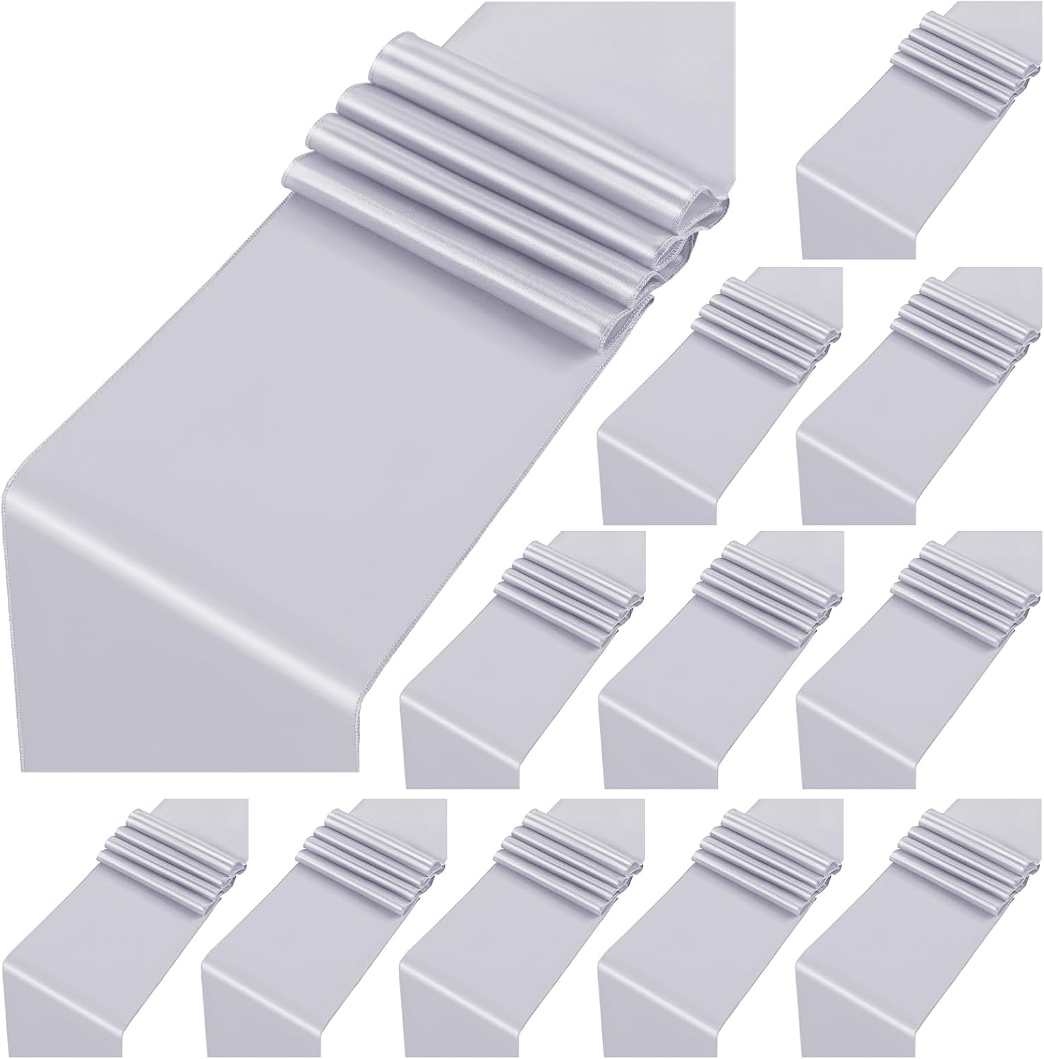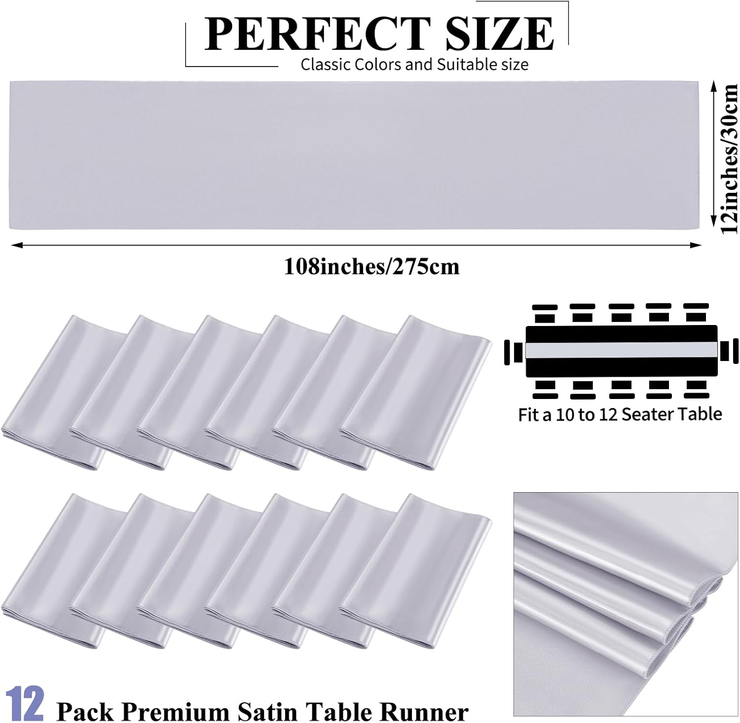 - đ„ăSet includesă12 Pack silver satin table runner measures 12" x 108" in size, appropriate for a table that can seat 8-10 people. This satin table runner can fit a 6ft/8ft rectangular table or round table well.This satin table runner is great for event table decorations.Our satin table runner make your dining table more dazzling and outstanding.Purchase our 12piece satin table runner and save even more.