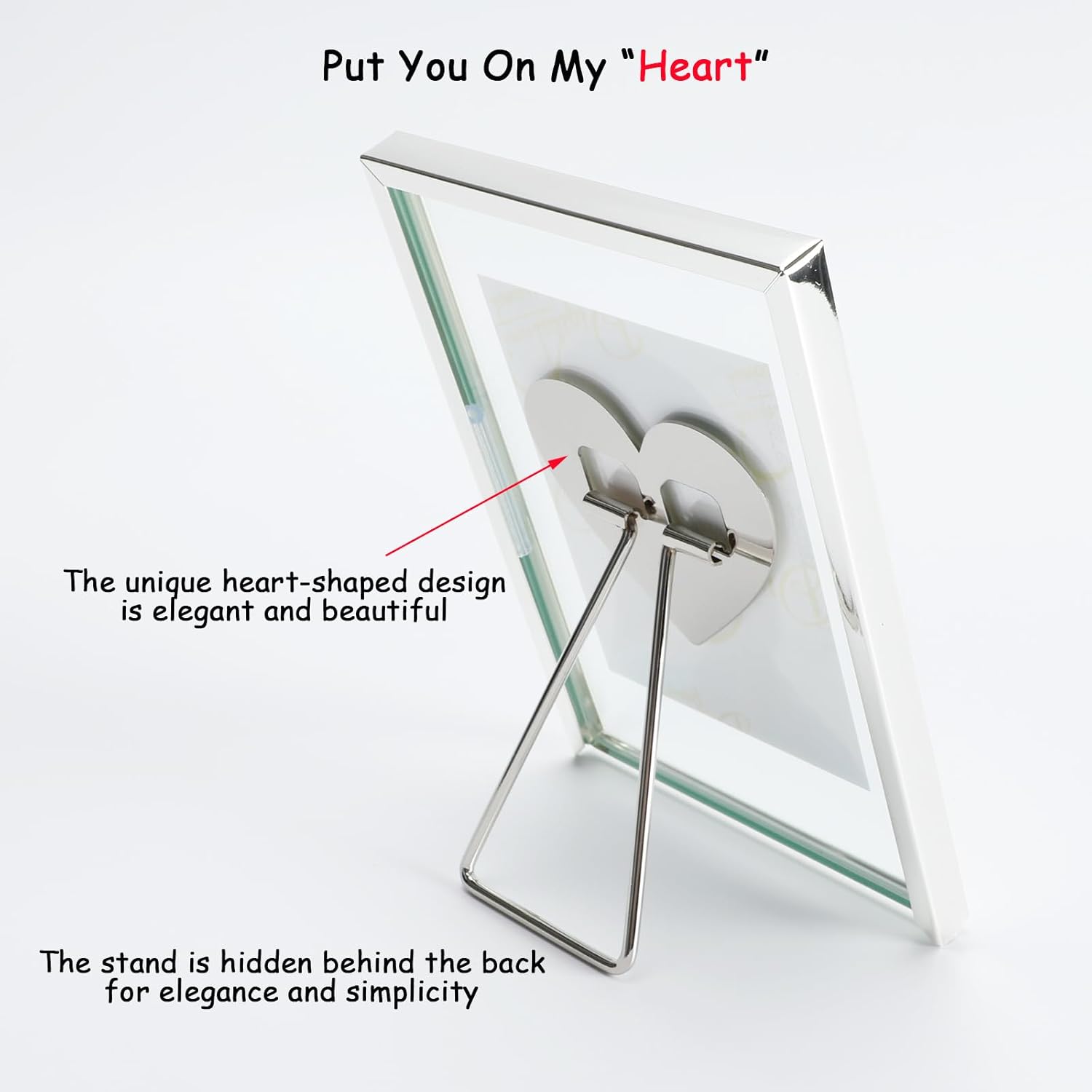 - 【Romantic Design】A silver metal frame with heart-shaped stand(Put you in my heart) and transparent glass, making it looks very romantic and elegant. It appears that the photo has a floating effect on it, So you can focus on the photo.