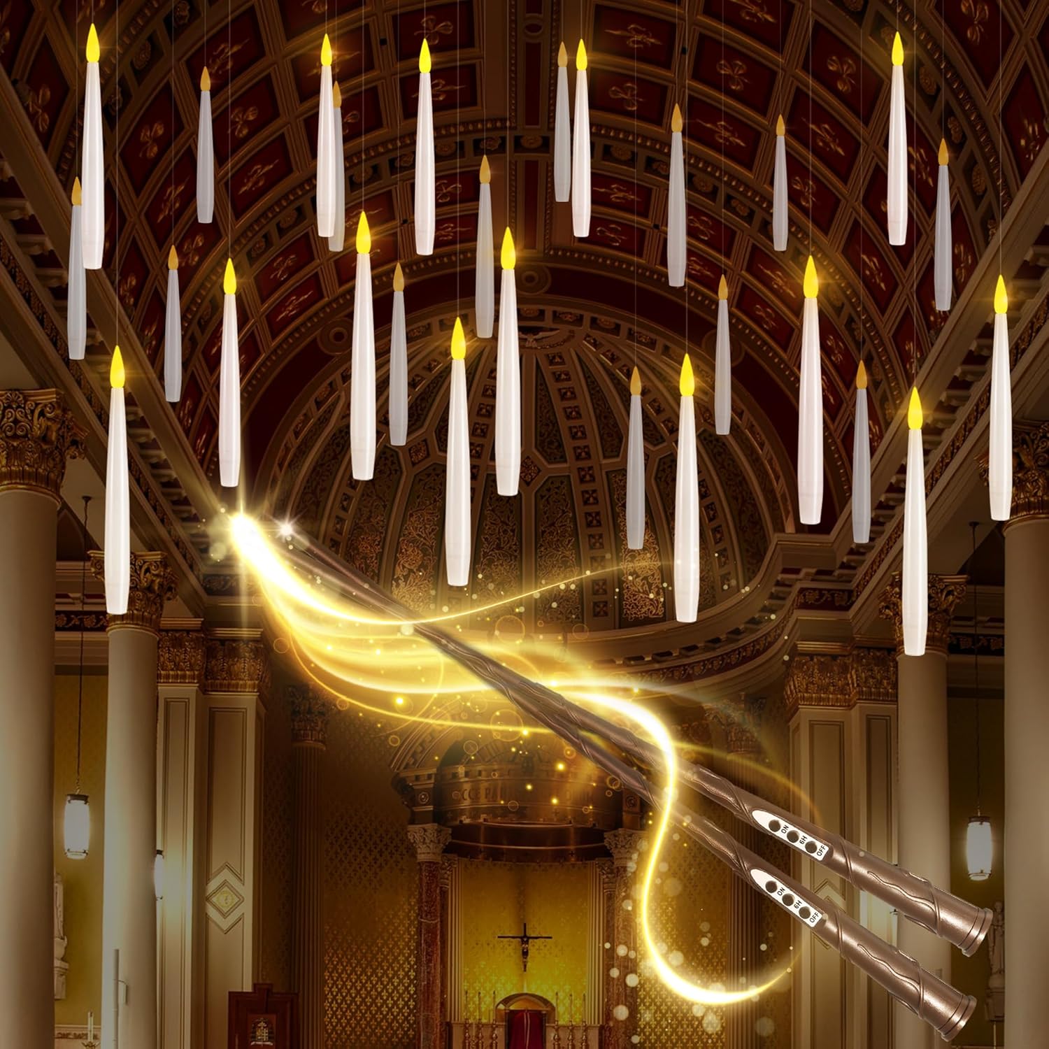 - 🔮BATTERY OPERATED CANDLES WITH REMOTE🔮 Package includes: 20 pack 6.1 inch tall LED candles with pre-attached fishing line, 2 magical wands remotes with ON/OFF/6H TIMER and several hooks. Each flameless candle requires only 1x AAA battery(not included)and lasts long in daily use, made from environment-friendly material, must be a good choice for family with kids and pets! You can create a magical floating candle effect anywhere you like.
