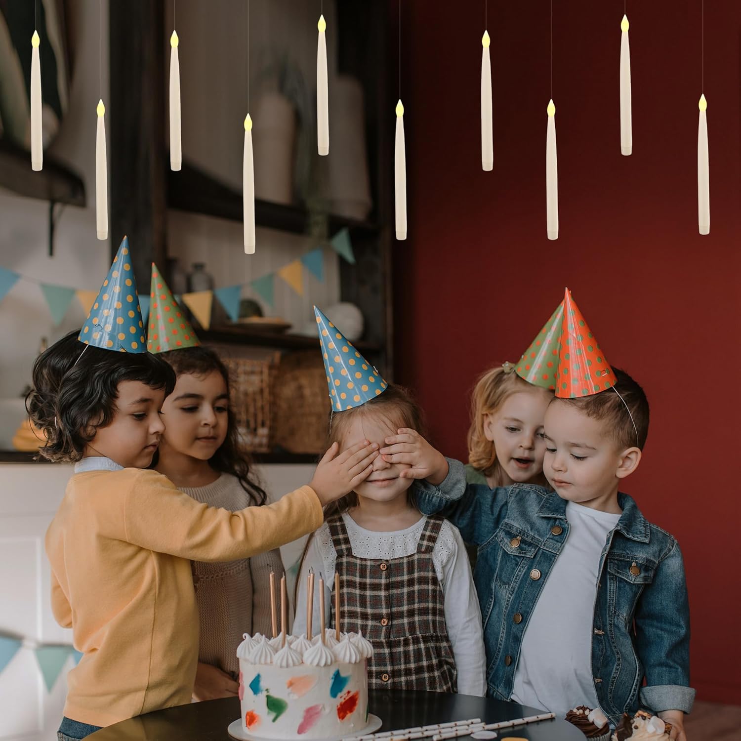 - 🔮FLAMELESS CANDLES FOR HALLOWEEN🔮 The hanging candles flicker with warm white light, which is cozy and romantic and won't cause any discomfort to Magicians' eyes. You can hang the floating candles on your ceiling or chandelier for creating a Magic Theme party. The fishing line(barely visible) connecting to the candles are about 4.9ft long, perfectly meet any DIY needs. They also work great for dinner table, room, bedroom, church service, birthday, Halloween, Christmas decoration.