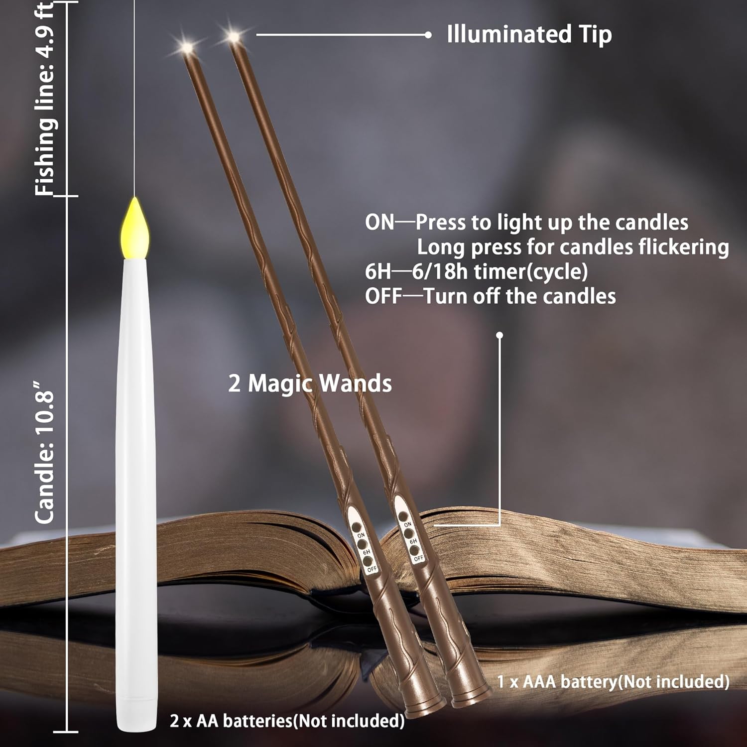 - 🔮BATTERY OPERATED CANDLES WITH REMOTE🔮 Package includes: 20 pack 10.8 inch tall LED candles with pre-attached fishing line, 2 magical wand remotes with ON/OFF/6H TIMER and several hooks. Each flameless candle requires only 2x AA batteries(not included)and lasts long in daily use, made from environment-friendly material, must be a good choice for family with kids and pets! You can create a magical floating candle effect anywhere you like.