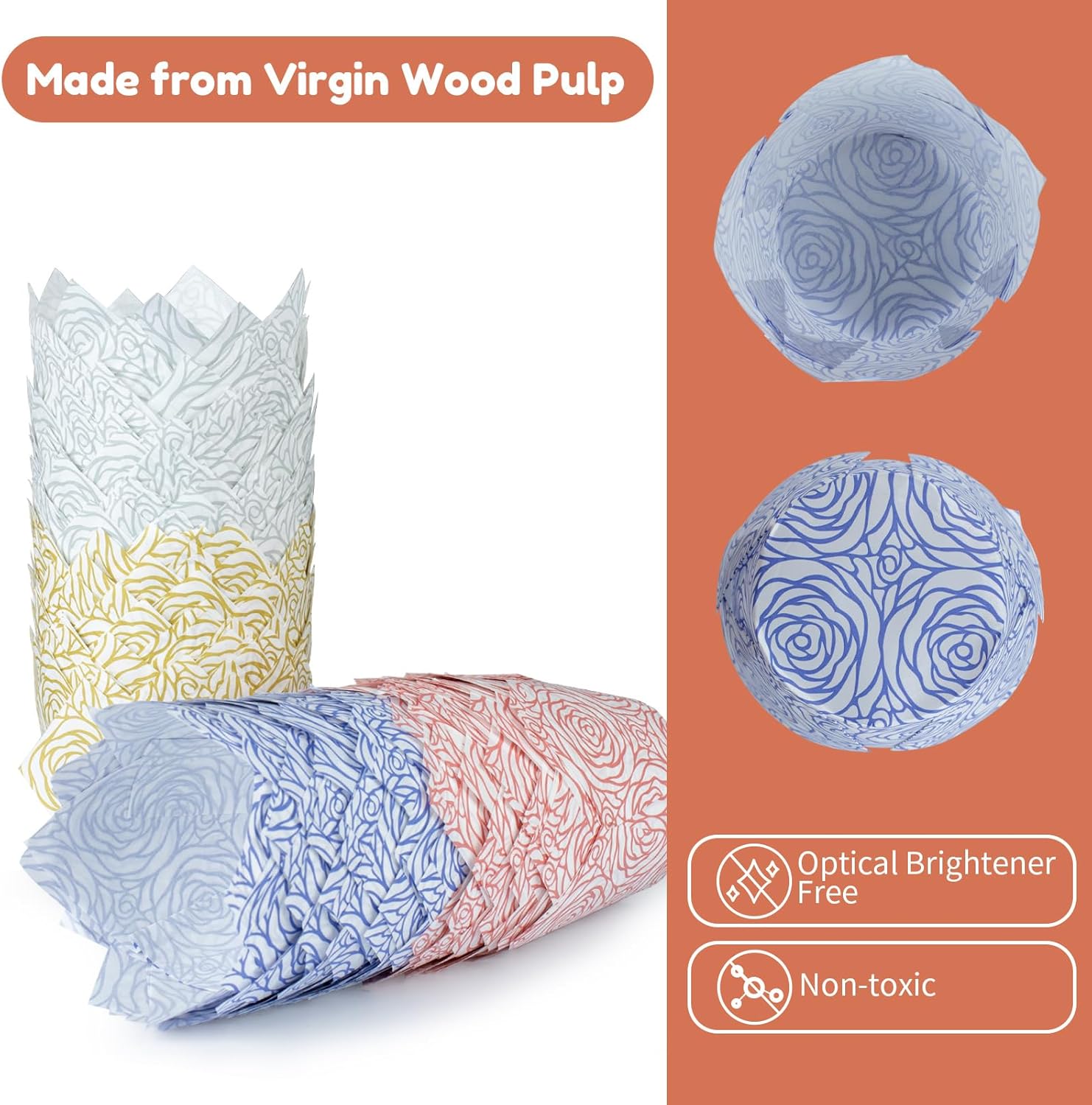 - Elegant and Vibrant: Add a touch of elegance to your cupcakes with our Tulip Paper Cupcake Liners. Featuring a beautiful rose print in four stunning colors, these liners are sure to make your cupcakes stand out.