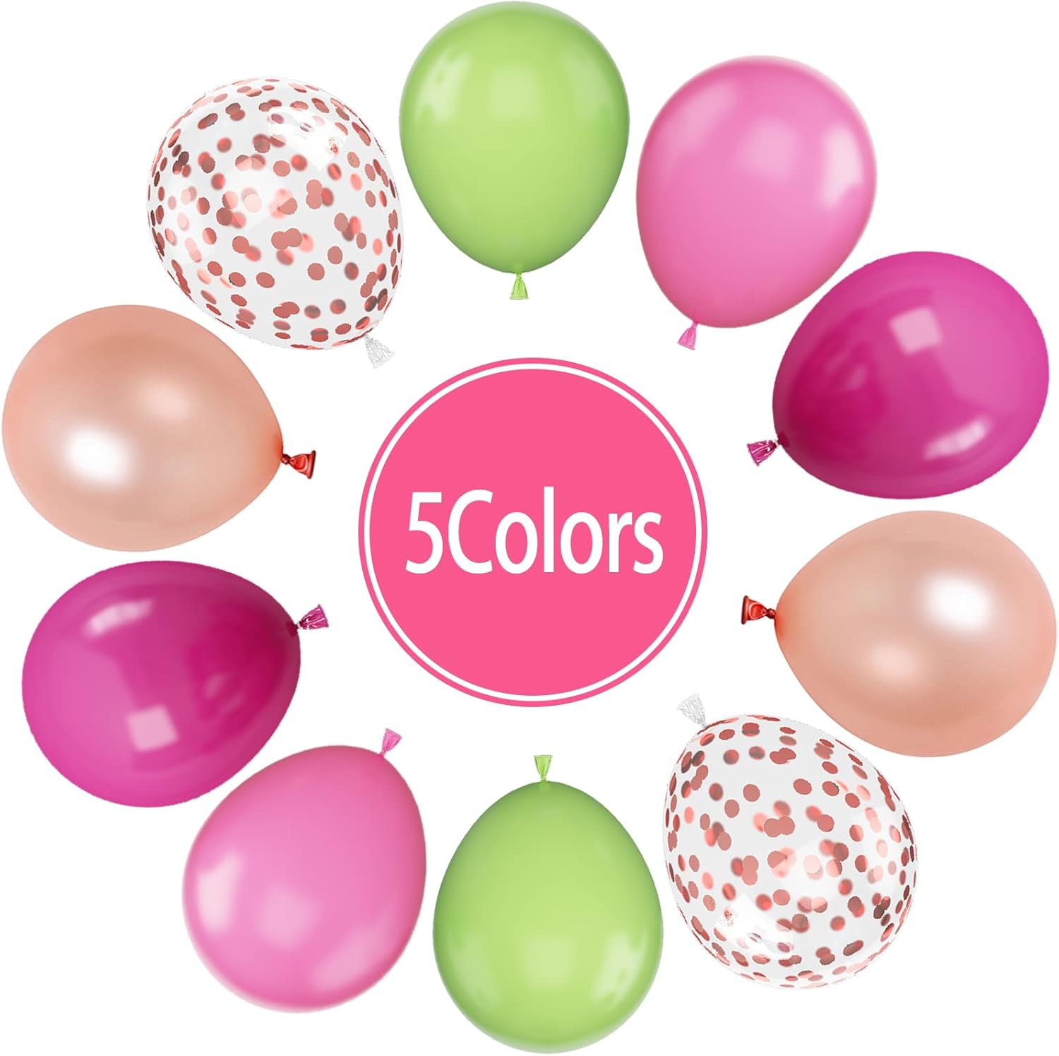 - Mixed Balloons Set: The 12 inch green hot pink rose gold balloons set includes 15pcs light green balloons, 15pcs pink balloons, 10pcs hot pink balloons, 10pcs pearl rose gold balloons, 10pcs rose gold confetti balloons, 2 roll of ribbon. 62pcs in total. A variety of tropical party latex balloons set is suitable for your beautiful art theme decoration.