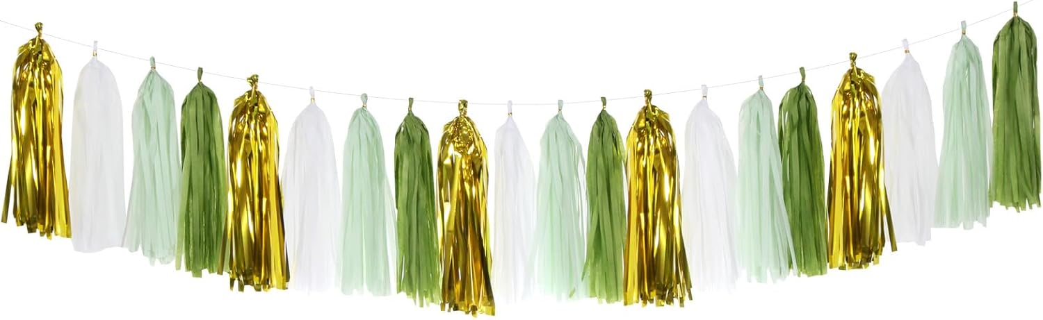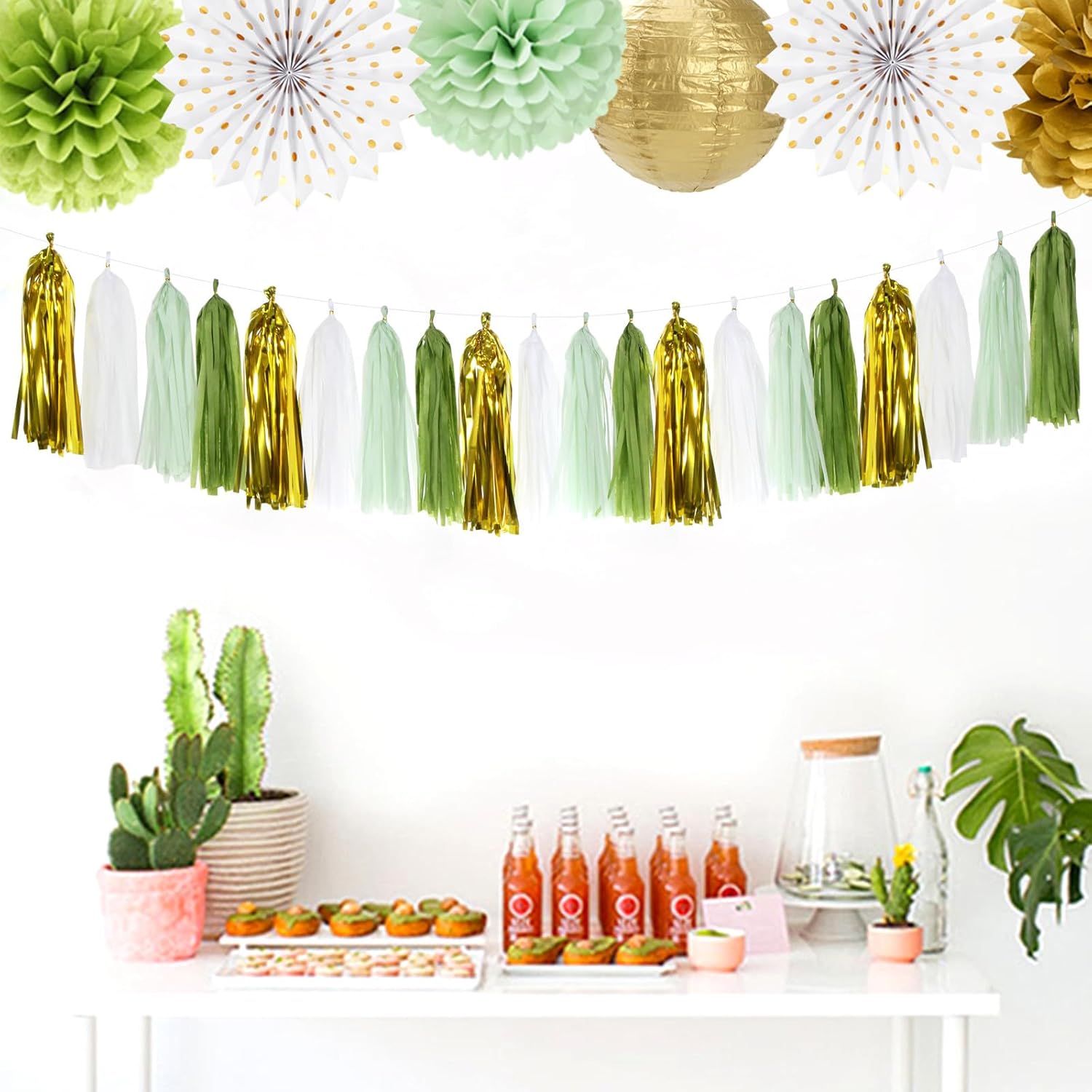 Sage-Olive Green Gold Party-Decorations Tassel-Garland - 20pcs Rustic Wedding Baby Shower Tassels Banner Streamers, Birthday Bachelorette Engagement Bridal Decor Panduola