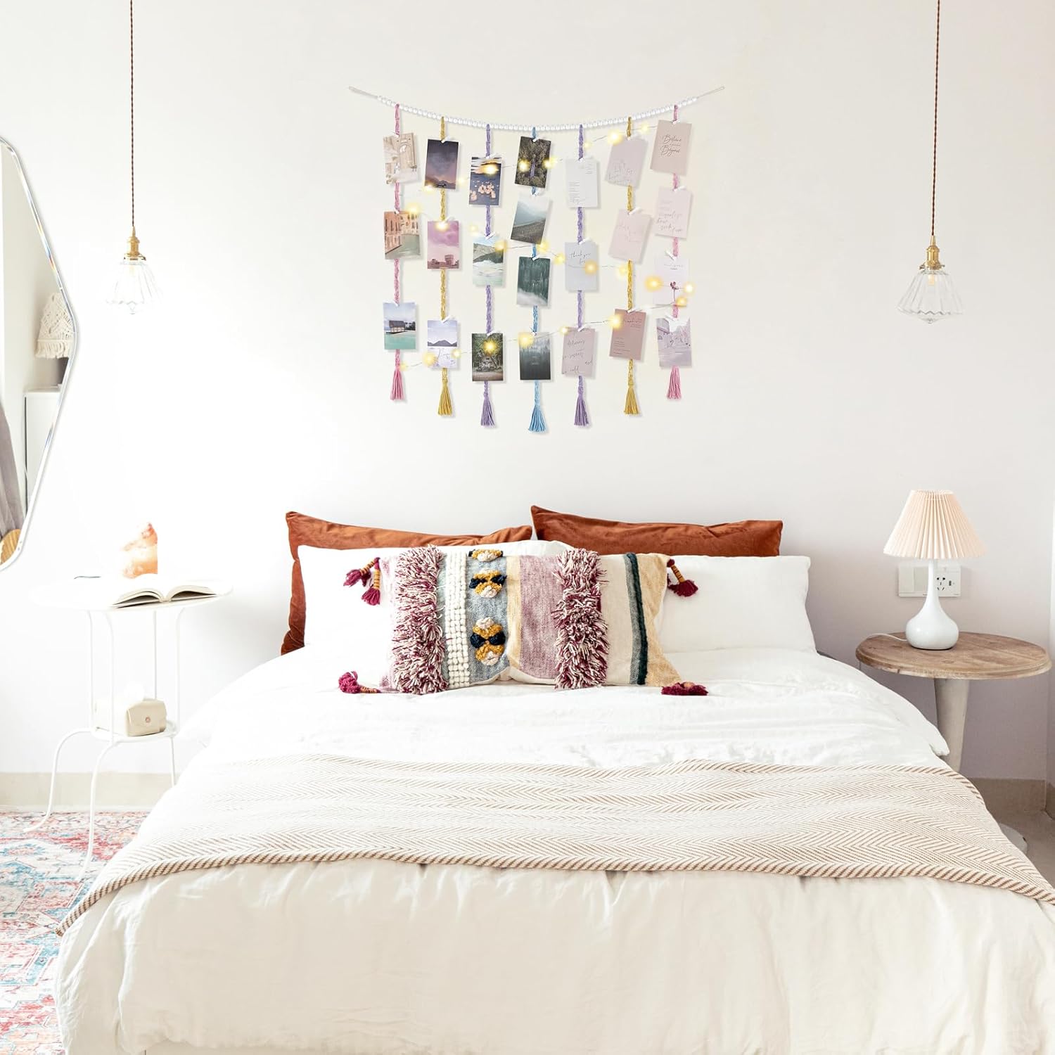 - The wall art, which has a chic outlook, uses a high quality string threaded through beads as a chain, with each vertical strand woven from macrame. The boho tassel garland comes with 45pcs removable wood clips, so you can display photos or artwork in different sizes on the string as you like. And the string lights are as soft as copper wire, so you are free to wind the shapes of the string lights into the macrame as you like.
