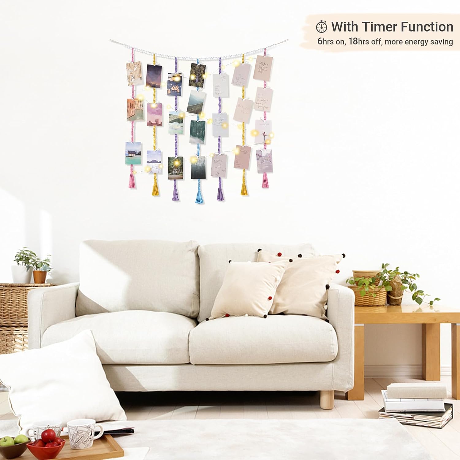 - Beautiful strip lights: The warm white lights string add a cozy and romantic atmosphere to your house. The strip lights together with the macrame photo organizer is a great addition to your room.The string light has an on/off switch on the battery case that you can use easily. (Note: batteries are Not included)