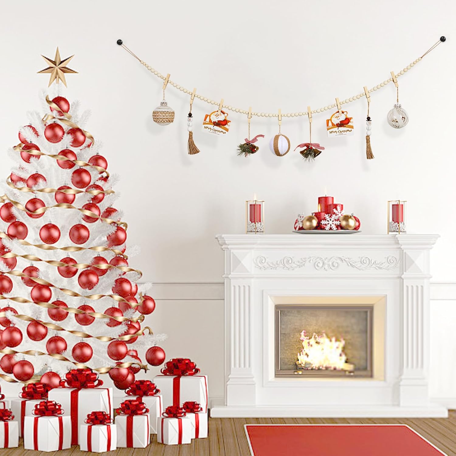 Hanging Photo Display Wall Decor, 2PCS Boho Wooden Bead Garland Collage Picture Frame with 9 Wood Clips for Bedroom, Living Room, Office, Dorm Decor, Photos Holder Teen Girl Gifts