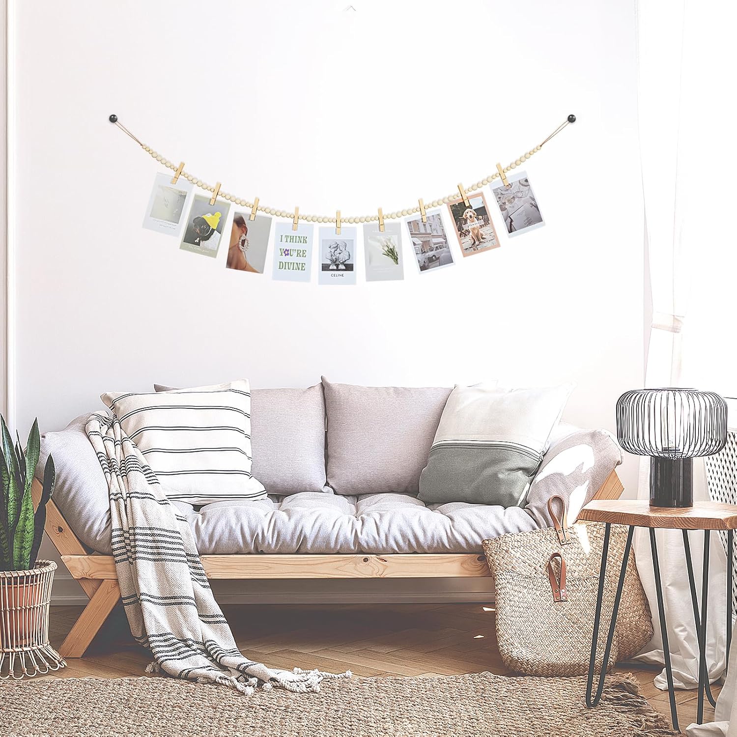 Hanging Photo Display Wall Decor, Boho Wooden Bead Garland Collage Picture Frame with 9 Wood Clips for Bedroom, Living Room, Office, Dorm Decor, Photos Holder Christmas Cards Teen Girl Gifts