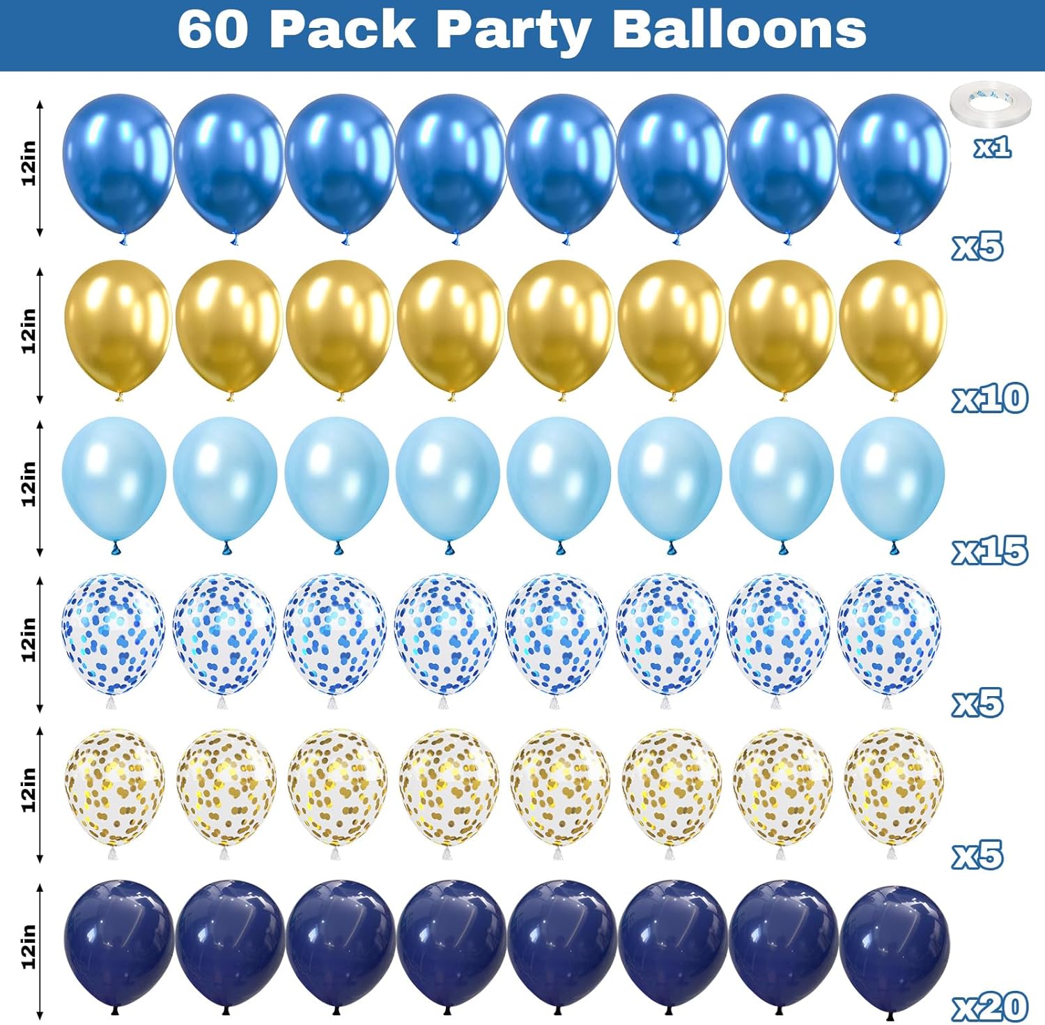 - ✨ Blue Gold Balloons: Our package includes 60pcs 12inch latex balloons (15pcs pearl blue balloons, 20pcs navy blue balloons, 10pcs metallic gold balloons, 5pcs metallic blue balloons, 5pcs blue confetti balloons, 5pcs gold confetti balloons) and 1pc balloon ribbon. Perfect for upscale events, birthday, or any occasion where elegance is key. Elevate your decor with these sleek and polished blue gold balloon that will leave a lasting impression on your guests.