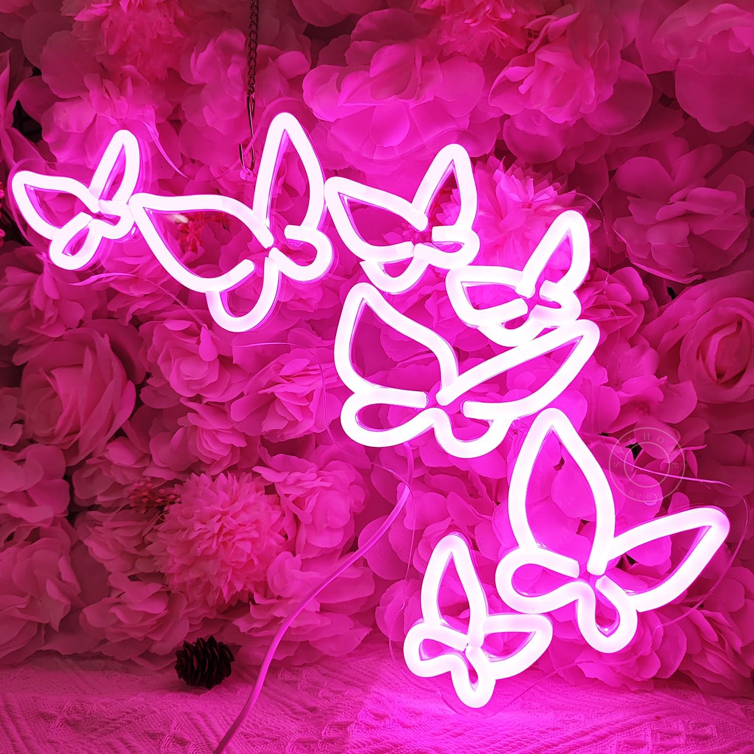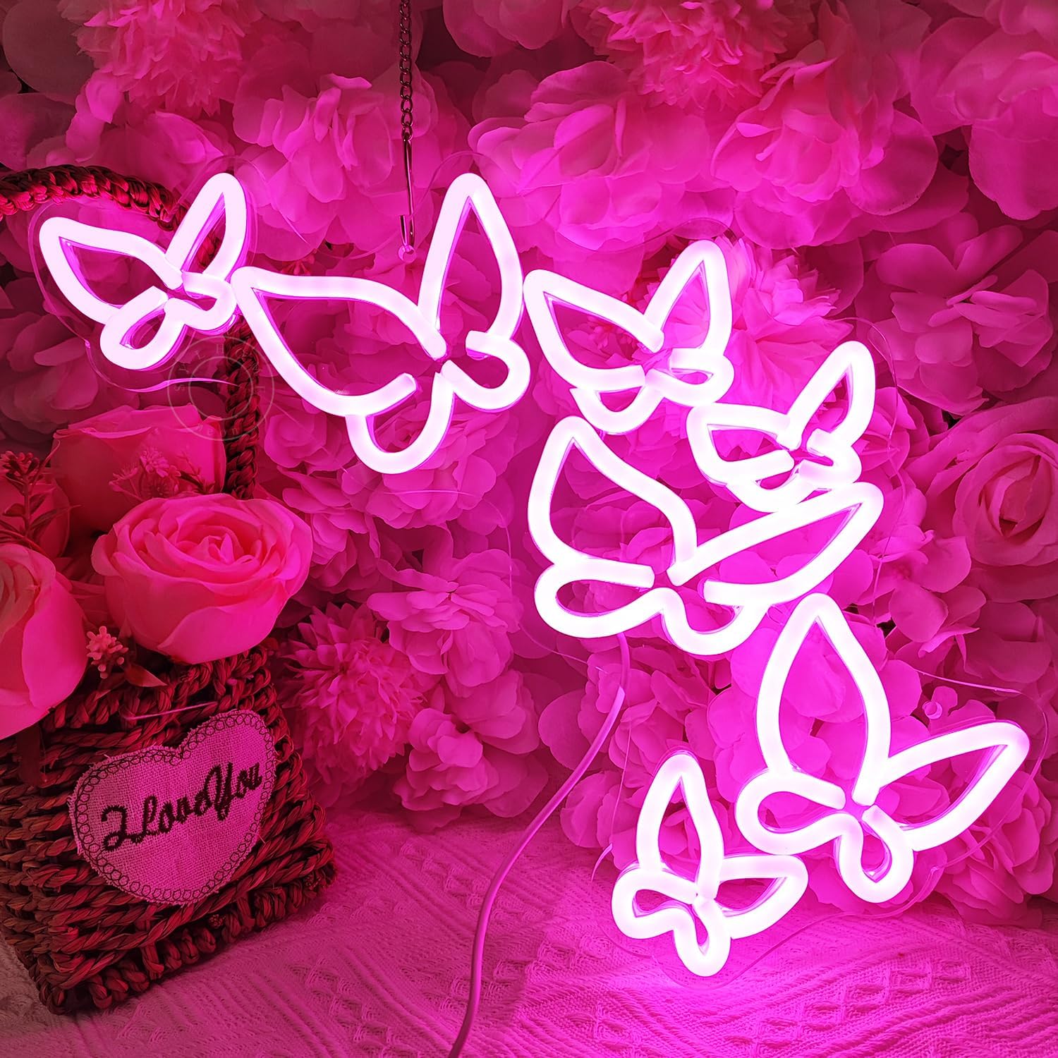 SYLHOME Pink Butterfly Led Neon Light Sign Girls Bedroom Kids Room Beauty Studio Living Room Wedding Birthday Christmas Party Light Up Sign 16.5" X 8.9" USB