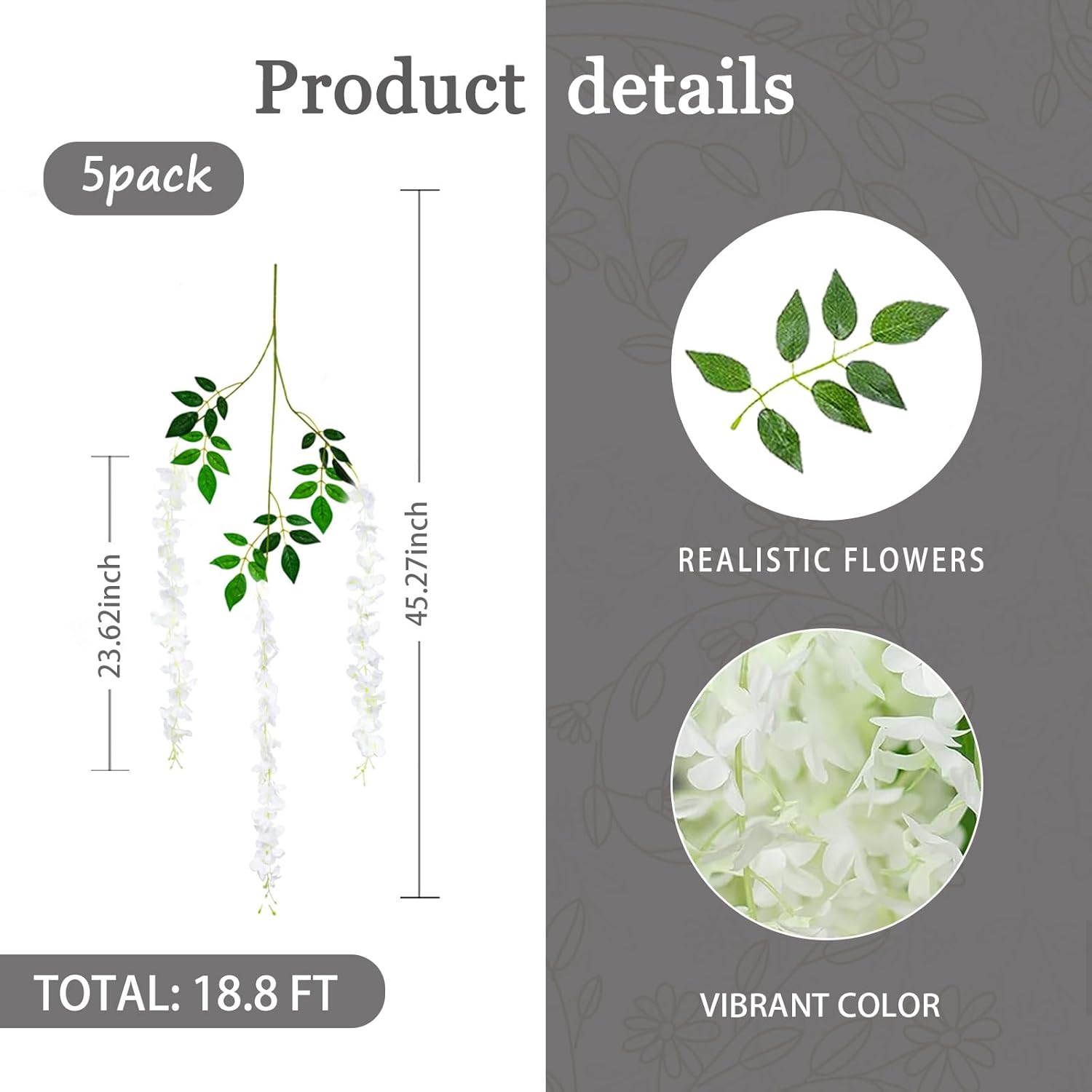 - 【Package Included】5 pieces of silk white wisteria hanging flowers, each length 45.27 inches. Every artificial wisteria garland has 3 branches and 6 leaves, the wisteria flower petal length is 23.62 inches. (Note: There may be some color differences in different lights)