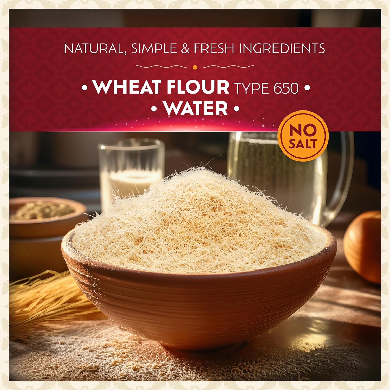 - MADE & METICULOUSLY PACKAGED IN TURKEY: No mess; the outer box is thoughtfully shrink-wrapped for your convenience. The kataifi in the cardboard box is also wrapped separately to ensure freshness and pristine condition. Halal product. INGREDIENTS: Wheat Flour Type 650 selected from the finest farms and producers of the region, Water. Allergen Warning: Includes wheat gluten