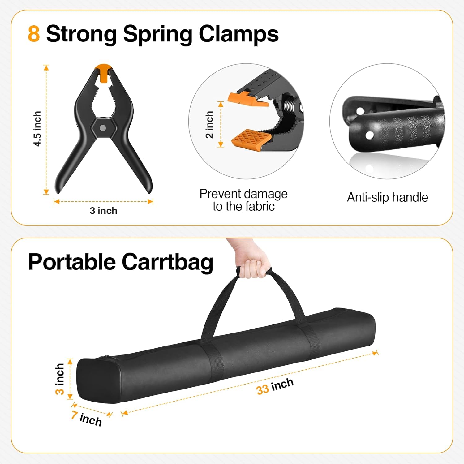 - 【Added Quality Accessories】4.5 in heavy-duty clamps made of strong and rugged type of plastic, grabs and stretches the backdrop tightly and present a better shooting effect. And 2 empty nylon sandbags can add extra weight and maintain stability when used
