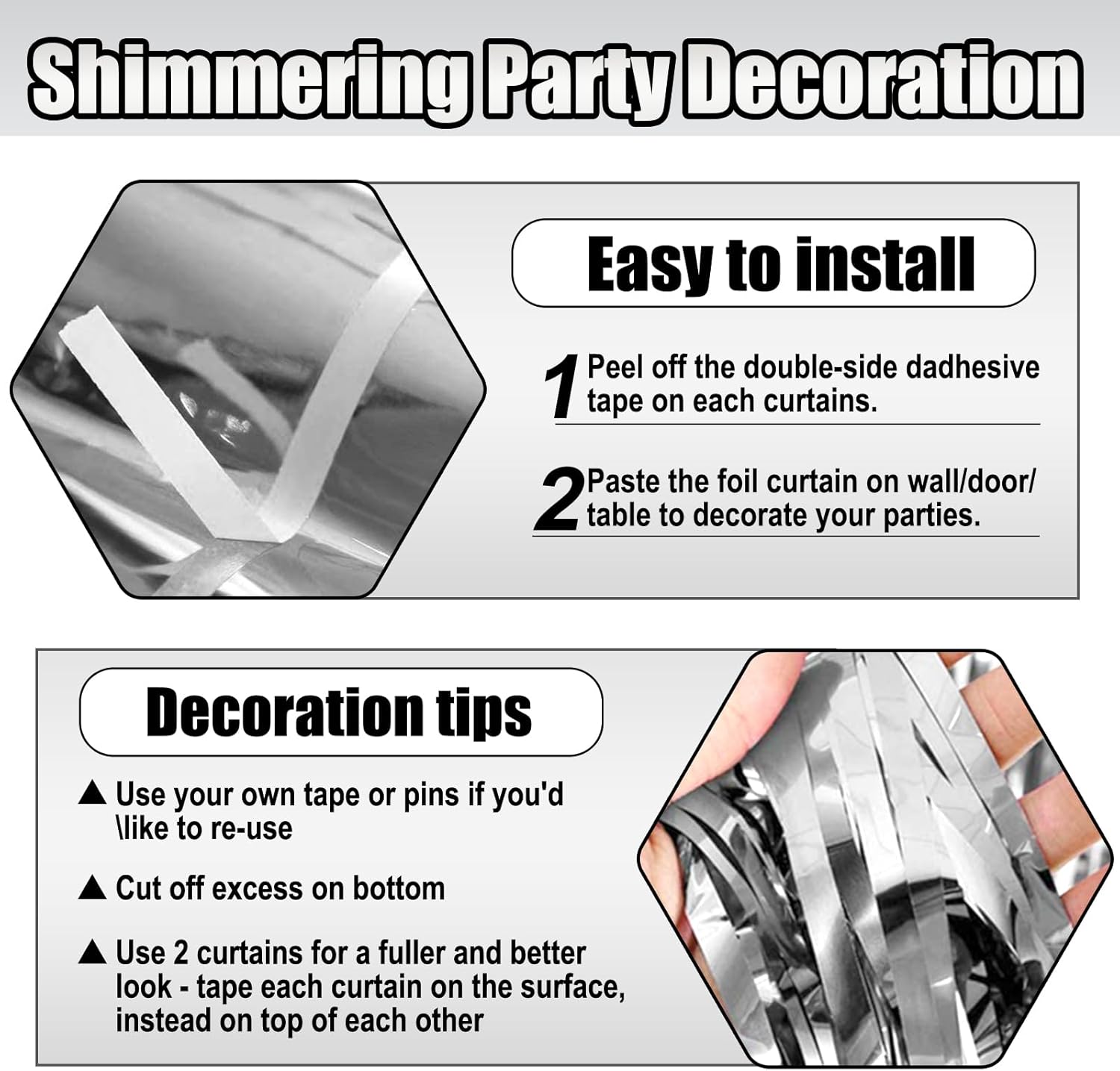 - Easy To Assemble | Strong Adhesive | Not Easy Fade : The foil fringe curtain backdrop party decorations come with double-sided adhesive tape, easy to use, just tear off the back of adhesive tape, then paste this streamers backdrop curtains on the top of wall, window, table, or as door fringe decoration.