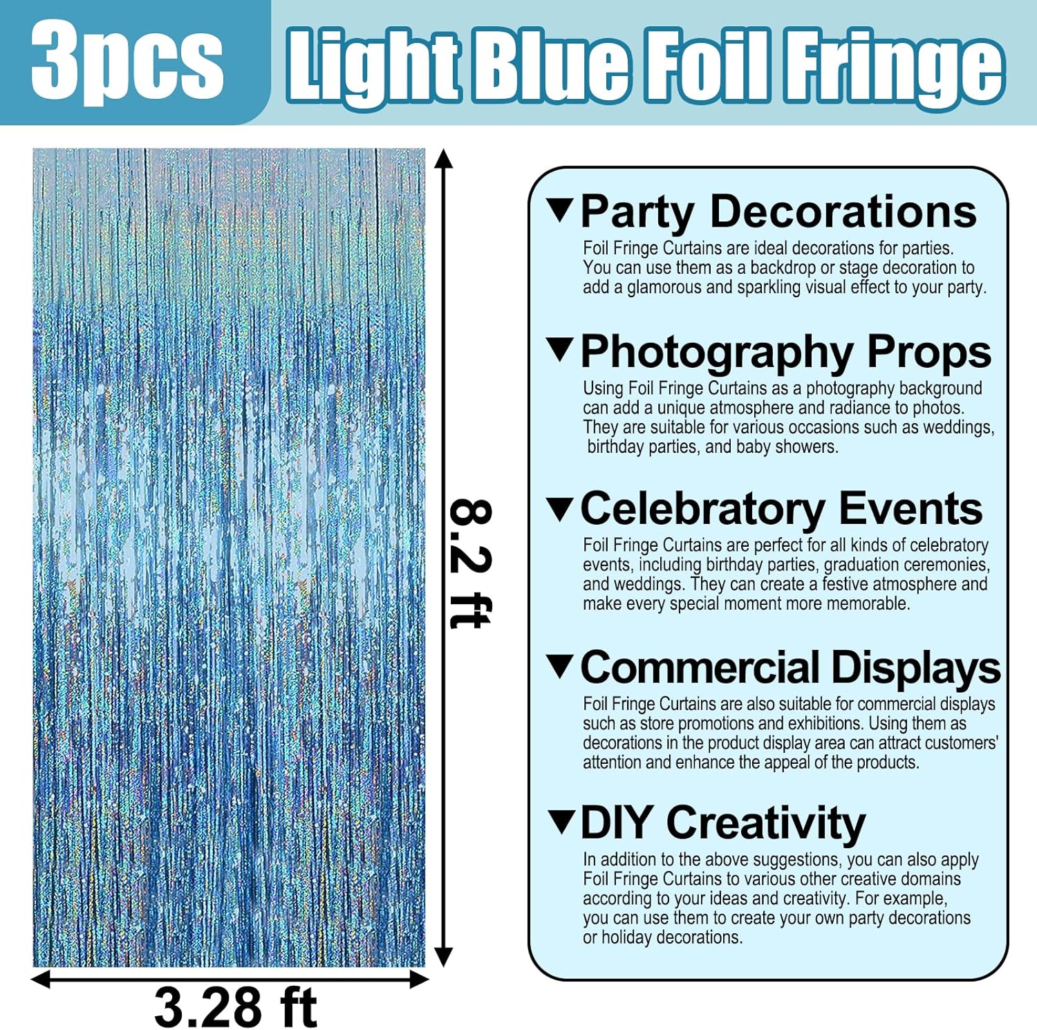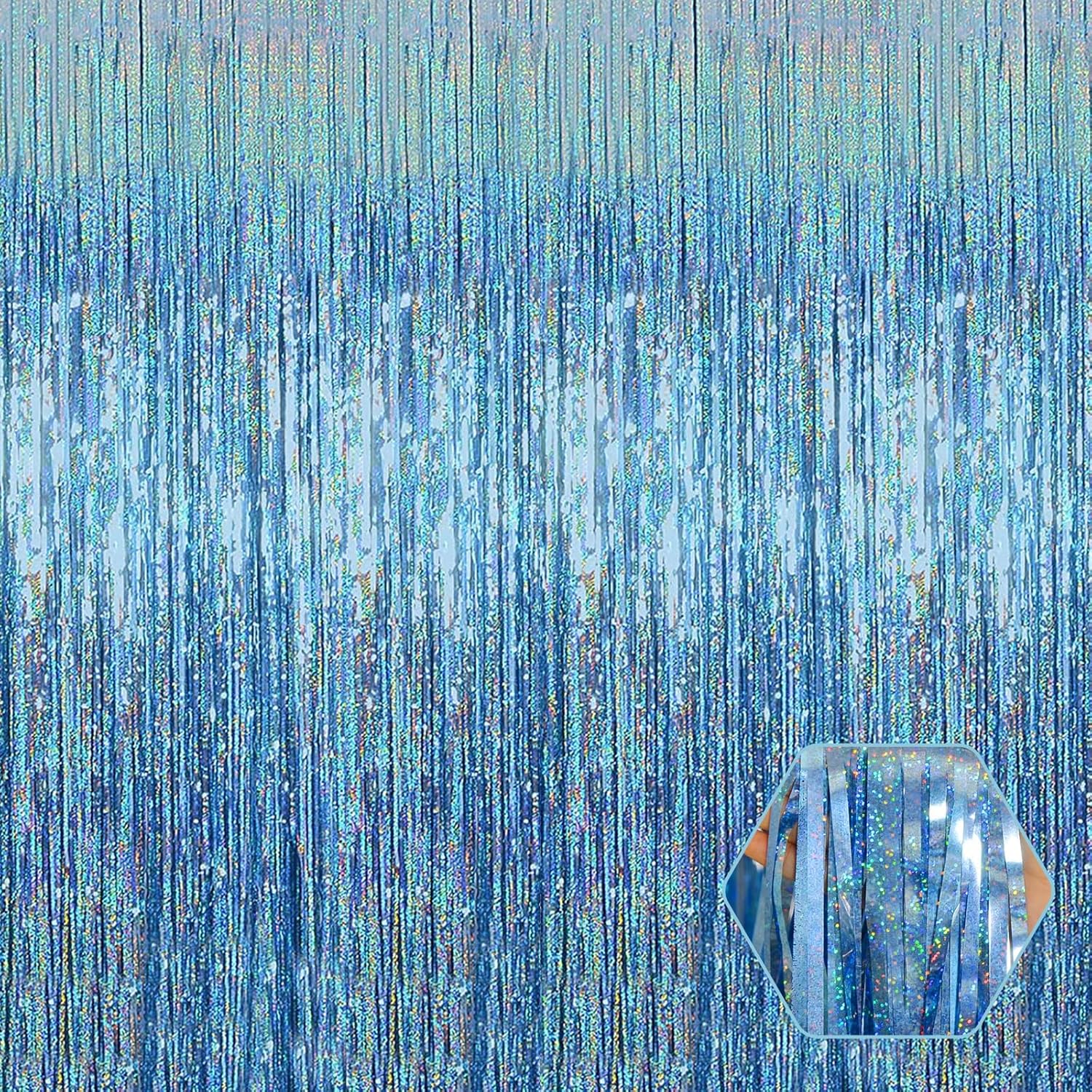 - 3.28Ft x 8.2Ft Feet | Vibrant Shiny Streamers : This sparkling tinsel blue fringe curtain is large size of 3.28ft x 8.2ft feet, pack of 3. Made of aluminium foil. This decorations for party backdrop will radiates laser like shine. and this will be a perfect party backdrop for the photo booth you had prepared for your friends and kids.
