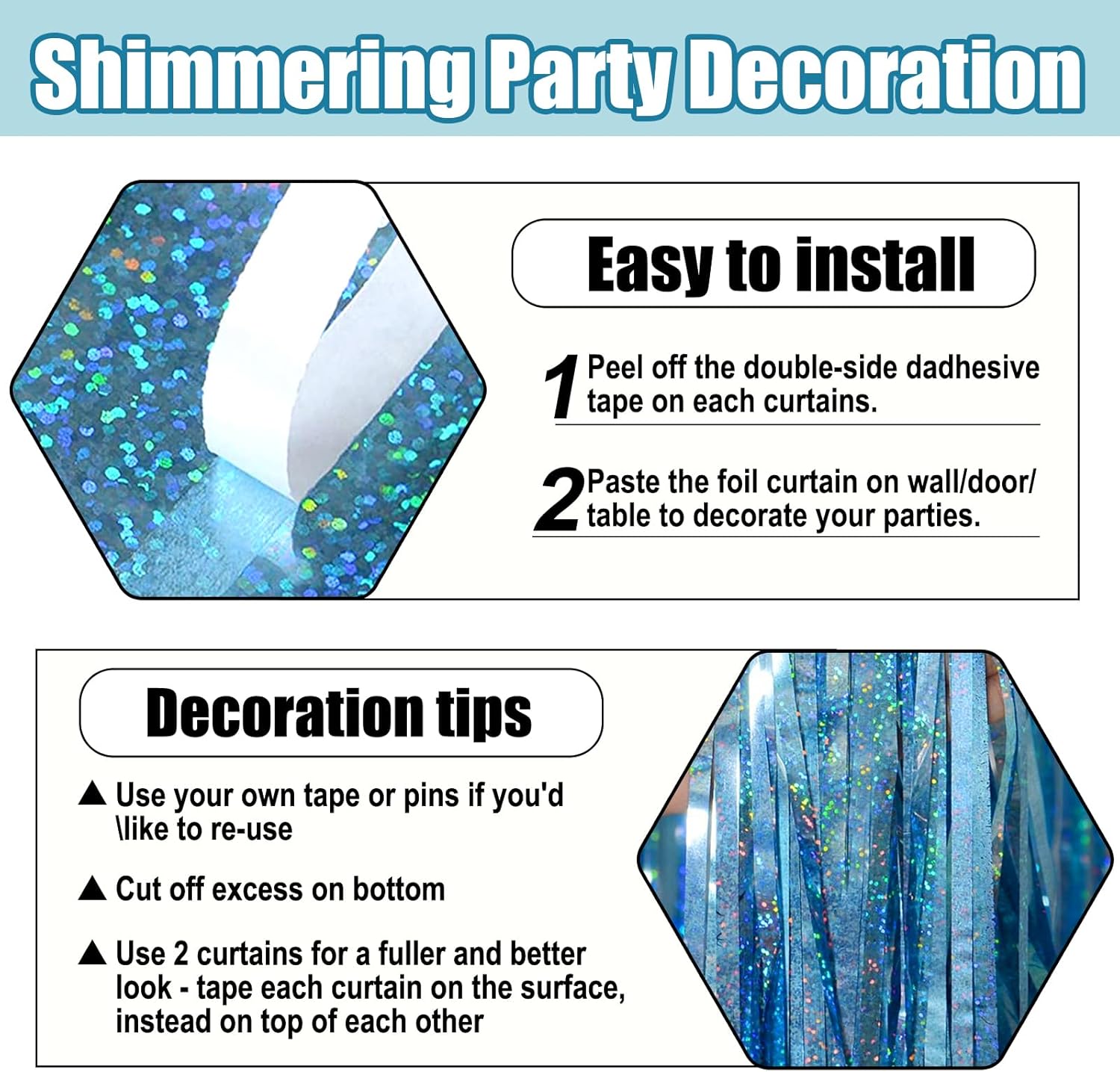 - Easy To Assemble | Strong Adhesive | Not Easy Fade : The foil fringe curtain backdrop party decorations come with double-sided adhesive tape, easy to use, just tear off the back of adhesive tape, then paste this streamers backdrop curtains on the top of wall, window, table, or as door fringe decoration.