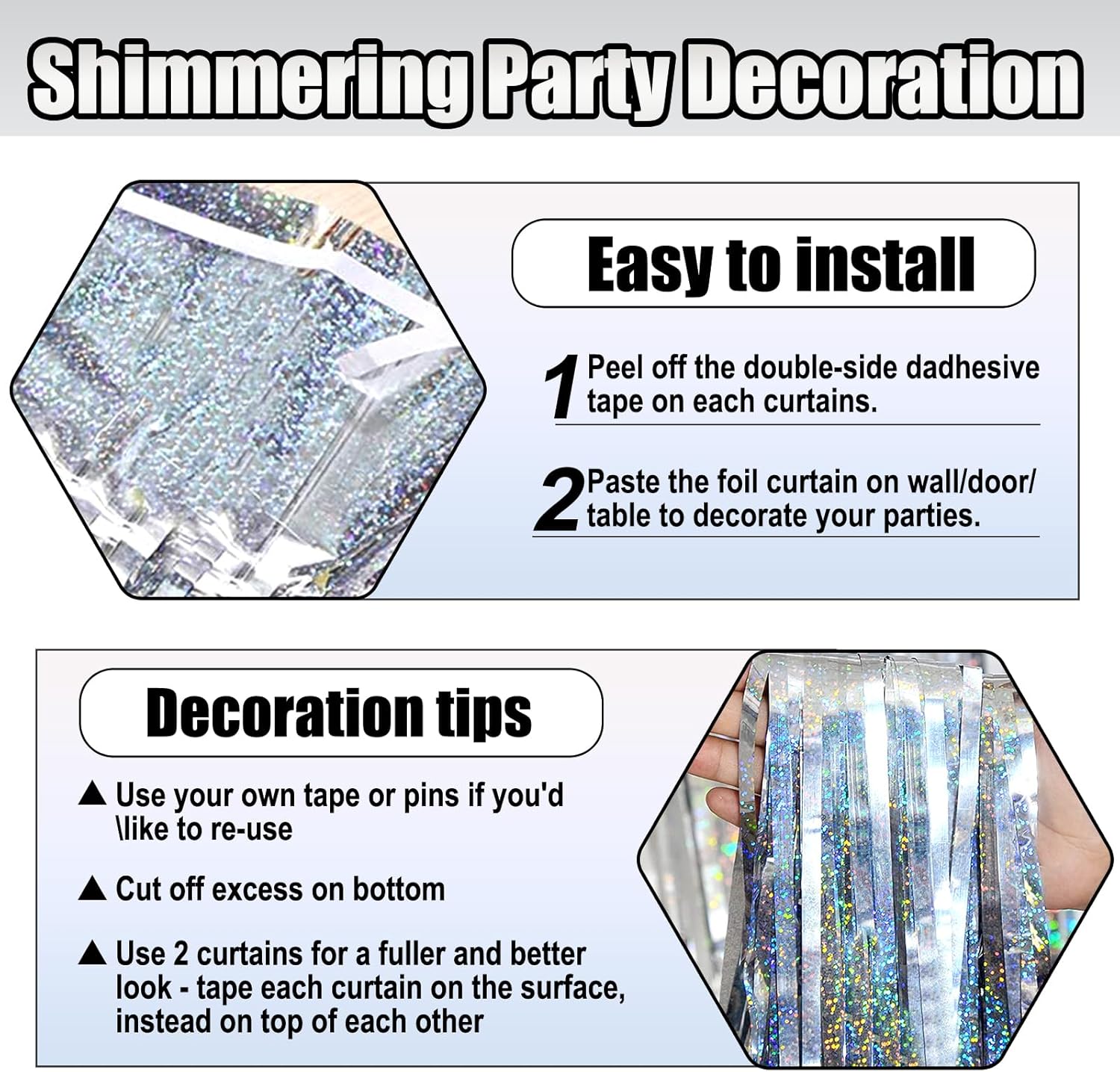 - Easy To Assemble | Strong Adhesive | Not Easy Fade : The foil fringe curtain backdrop party decorations come with double-sided adhesive tape, easy to use, just tear off the back of adhesive tape, then paste this streamers backdrop curtains on the top of wall, window, table, or as door fringe decoration.