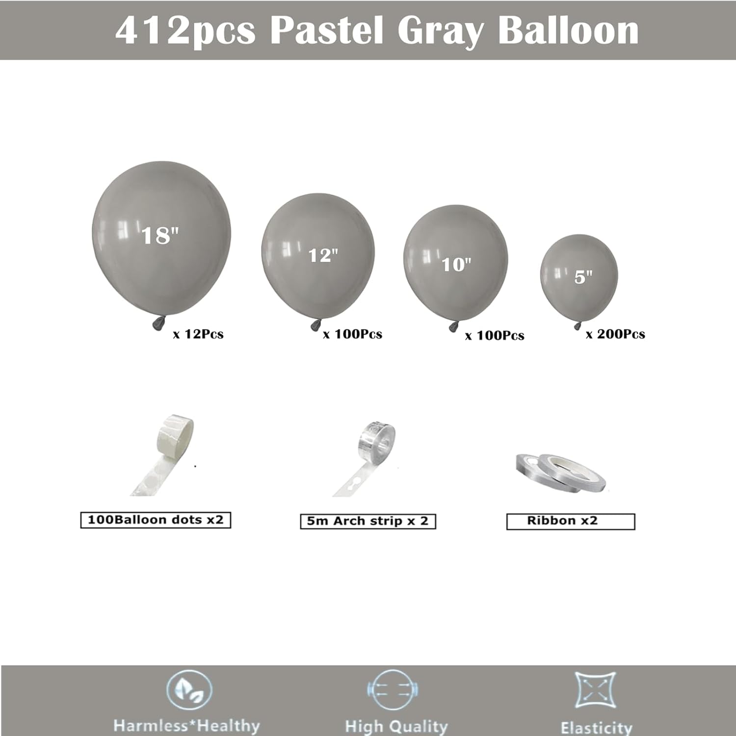 - GRAY BALLOON ARCH GARLAND KIT: Includes 412 Pastel Gray Balloons, 18inch 12pcs, 12inch 100pcs, 10inch 100pcs, 5inch 200pcs , 2 rolls of Balloon glue point(200pcs), 2 rolls of balloon decoration strip(32.8 feet / 5m*2 with 220 holes), 2 roll of ribbon. plenty in quantity, perfect for making indoor or outdoor them decoration.
