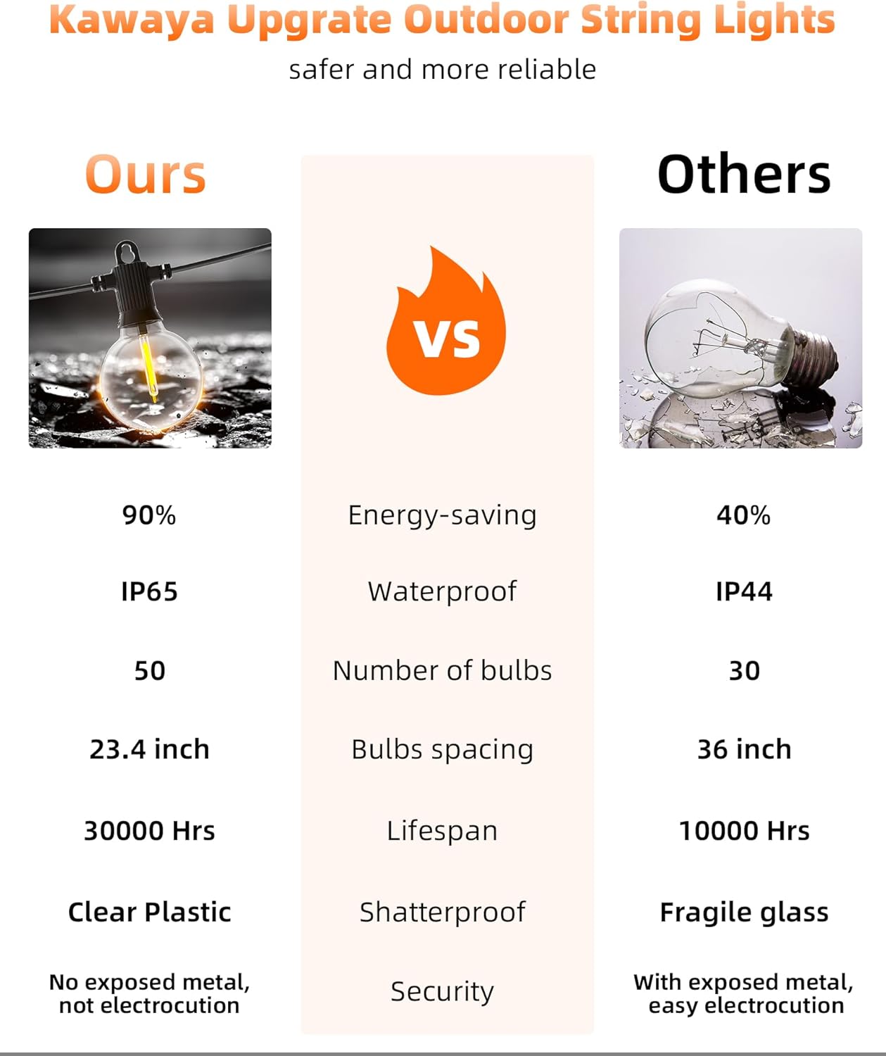 - 【IP65 WATERPROOF & SHATTERPROOF】: Kawaya 100FT waterproof string lights for outdoor consists of 50 clear bulbs(+2 spare). IP65 waterproof G40 bulb has a good sealing structure and works well in rainy days. Globe bulbs are made of thick, unbreakable modern plastics, which can stand very high and very low temperatures, not easy to burn out.