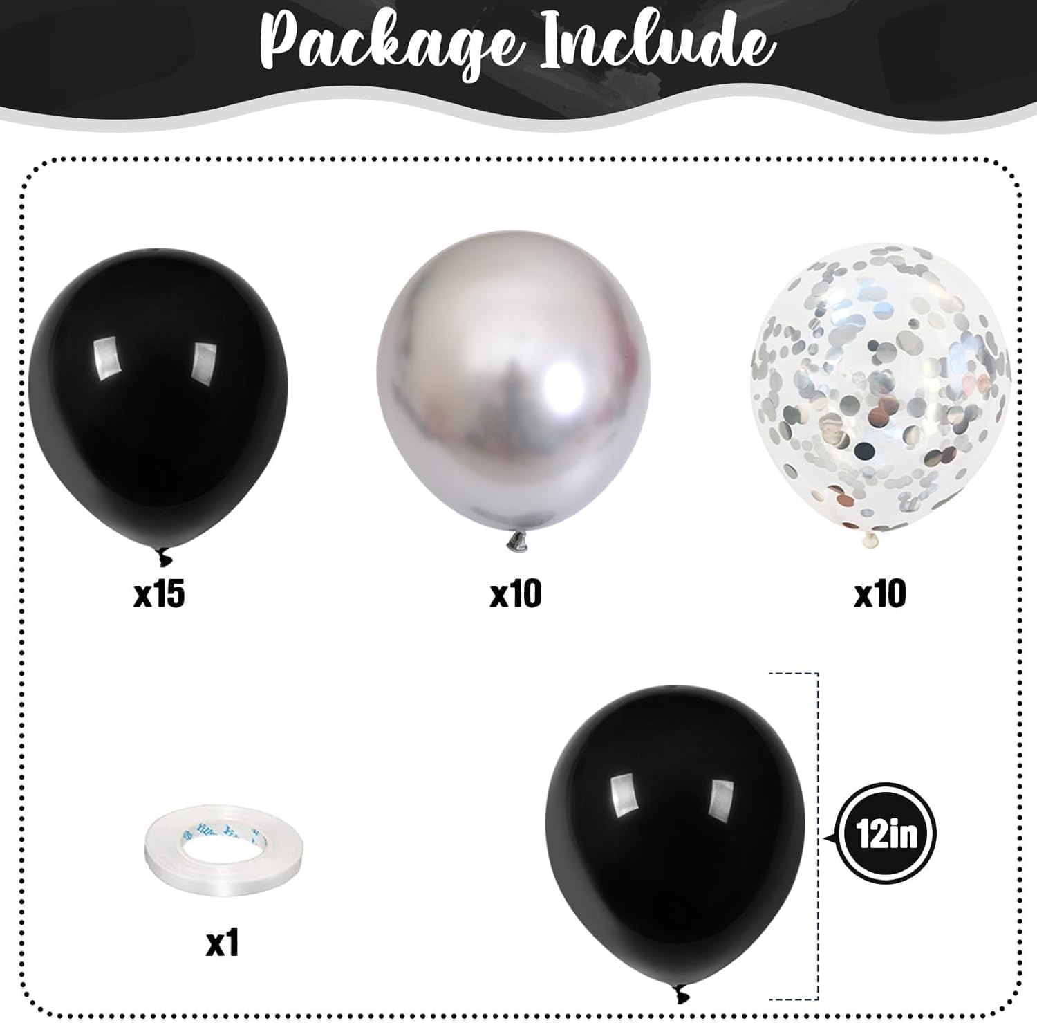 - π Black Silver Balloons - You will get 35 pieces 12 inch latex party balloons set, includes matte black 15pcs, metallic silver 10pcs, silver confetti 10pcs, come with 1pc white balloon ribbon. Perfect for women men birthday baby bridal shower wedding new year party decorations supplies.