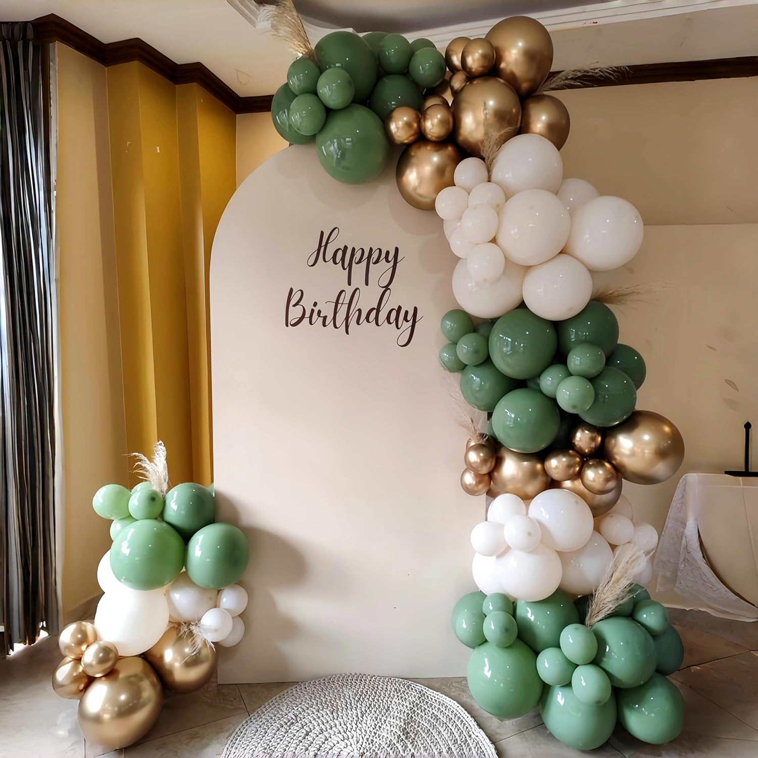 - π Sage Green Gold Balloons - You will get 35 pieces 12 inch latex party balloons set, includes olive green 13pcs, matte white 10pcs, metallic gold 7pcs, gold confetti 5pcs, come with 1pc gold balloon ribbon. Perfect for girls boys jungle birthday baby bridal shower wedding party decorations supplies.