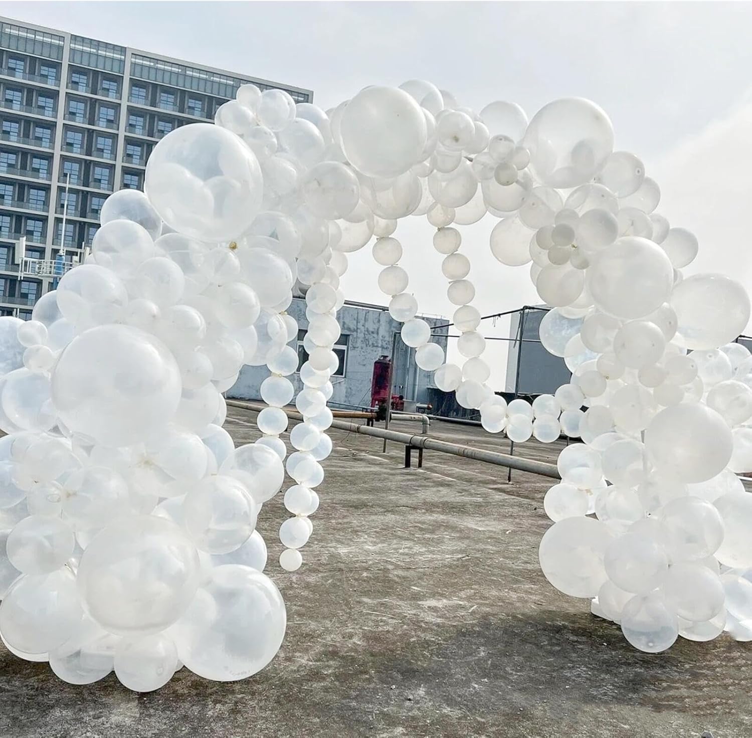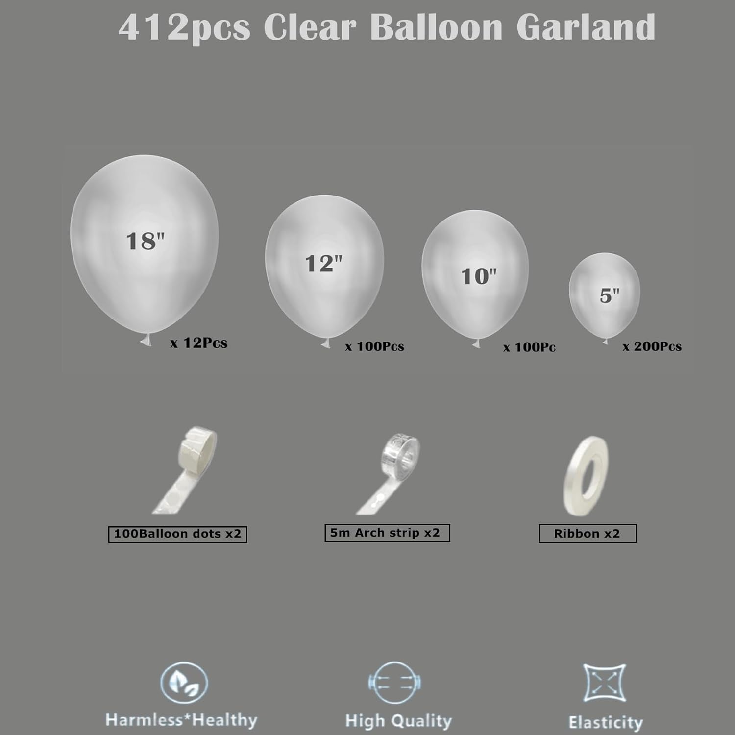 - CLEAR BALLOON ARCH GARLAND KIT: Includes 412 Clear Balloons, 18inch 12pcs, 12inch 100pcs, 10inch 100pcs, 5inch 200pcs , 2 rolls of Balloon glue point(200pcs), 2 rolls of balloon decoration strip(32.8 feet / 5m*2 with 220 holes), 2 roll of ribbon. plenty in quantity, perfect for making indoor or outdoor them decoration.