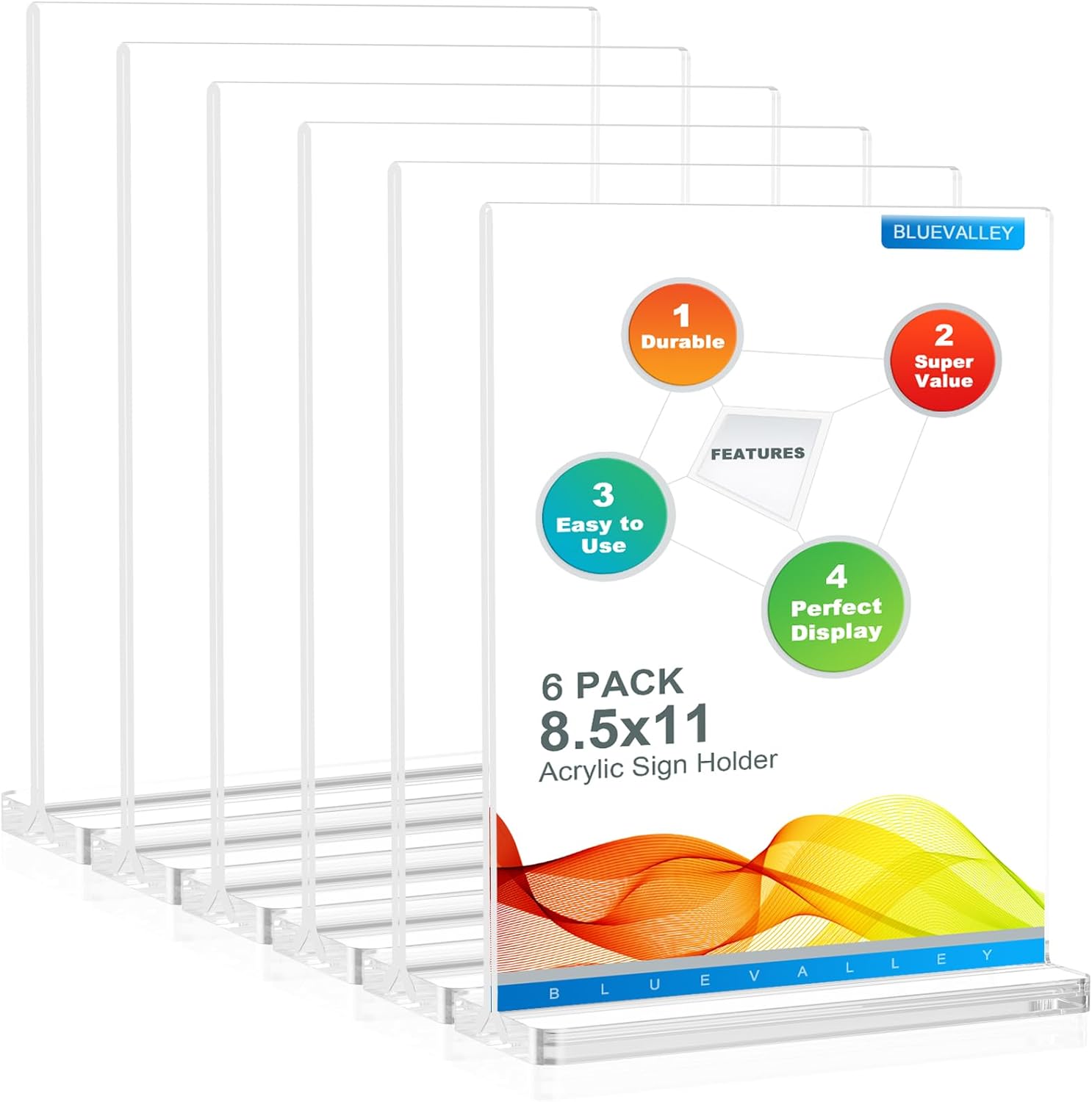 BlueValley Acrylic Sign Holder 8.5 x 11 Vertical - Double Sided Clear Sign Holders Plastic Stands for Display-6 Pack Document Paper Sign Stand for Table Top, Office, Restaurant, Store, Wedding, Party, Show Fairs