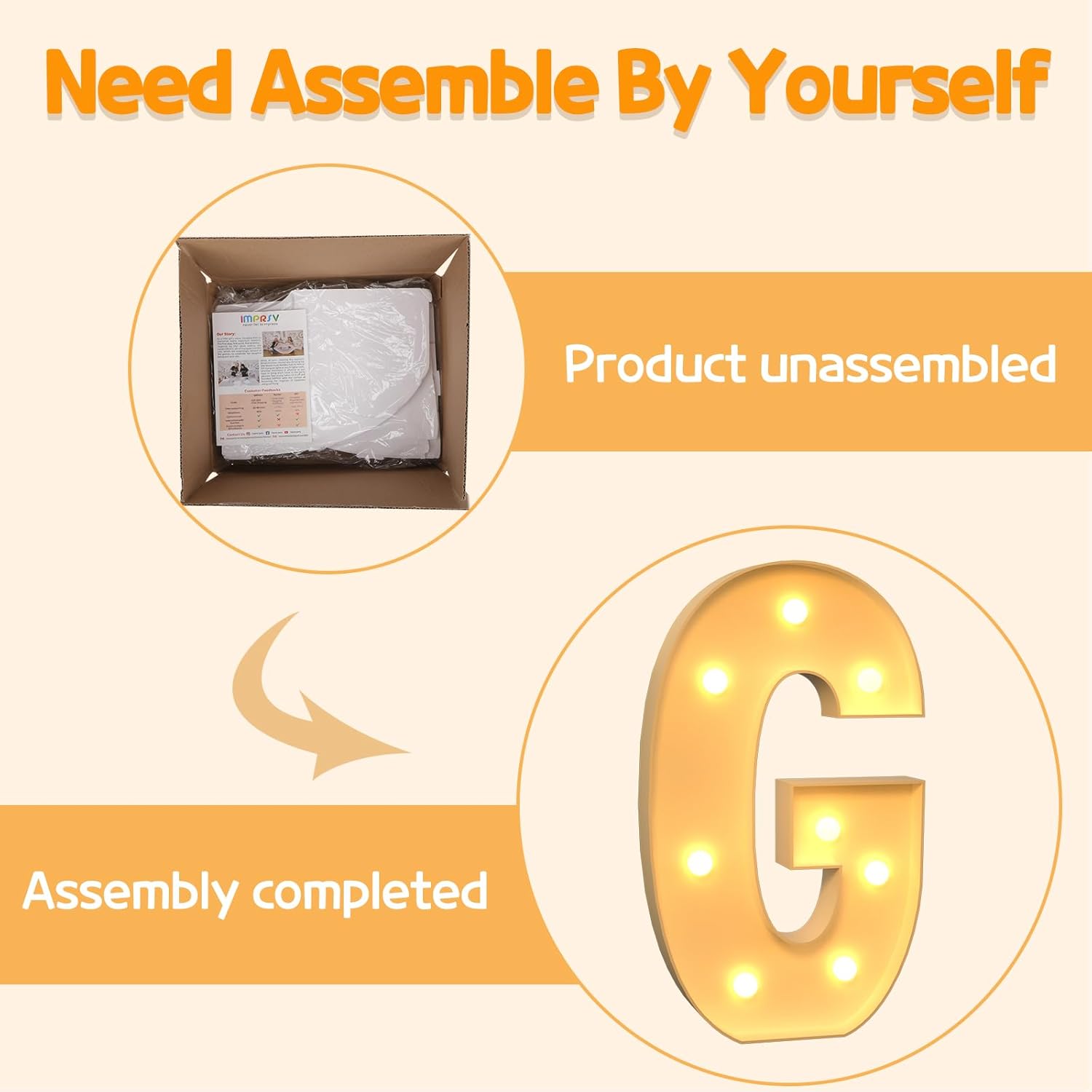 - Assembly Required: Our large marquee letters is made from foam board and easy to assemble with our splicing mode. Just follow the numbered instructions to align and insert the bottom plate, and reinforce it with a hot glue gun. Then, you're done!