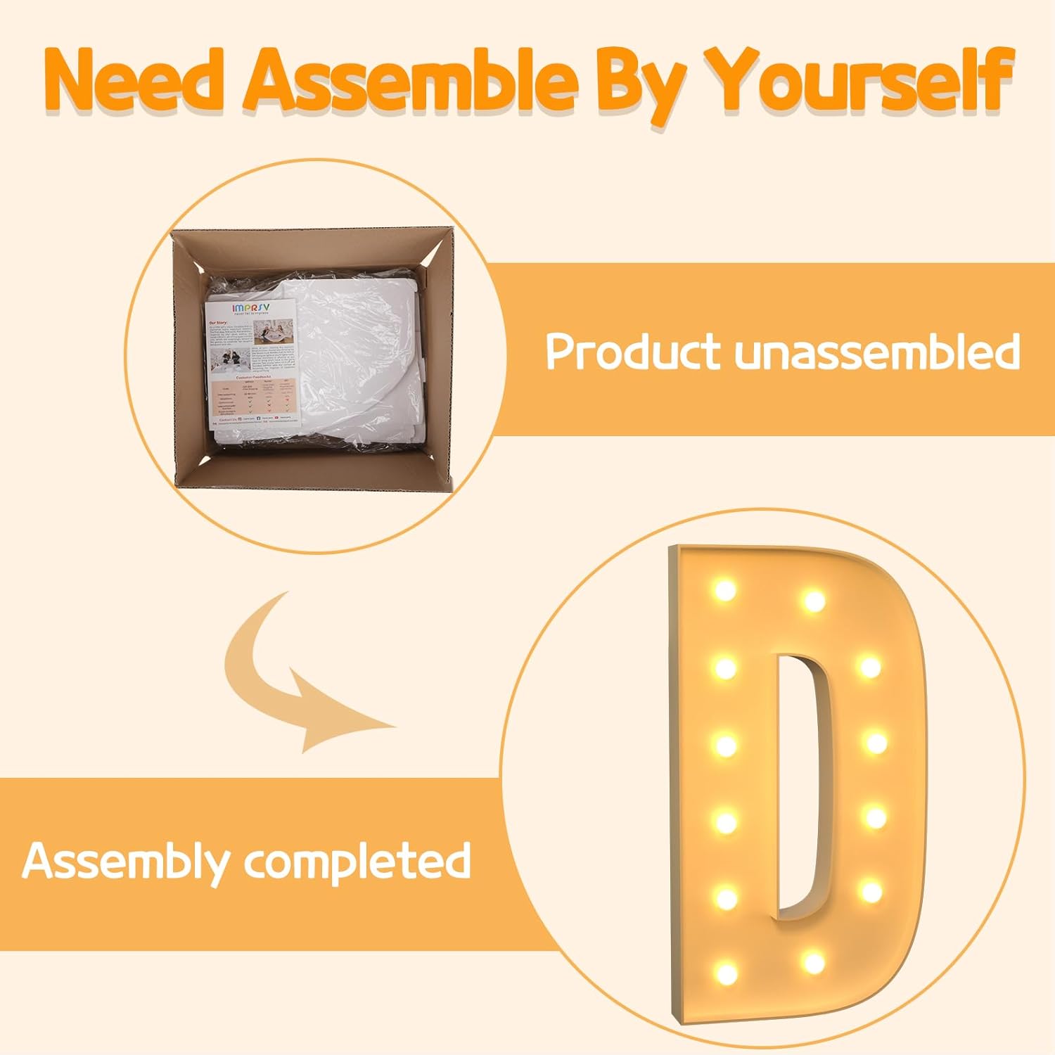 - Assembly Required: Our large marquee letters is made from foam board and easy to assemble with our splicing mode. Just follow the numbered instructions to align and insert the bottom plate, and reinforce it with a hot glue gun. Then, you're done!