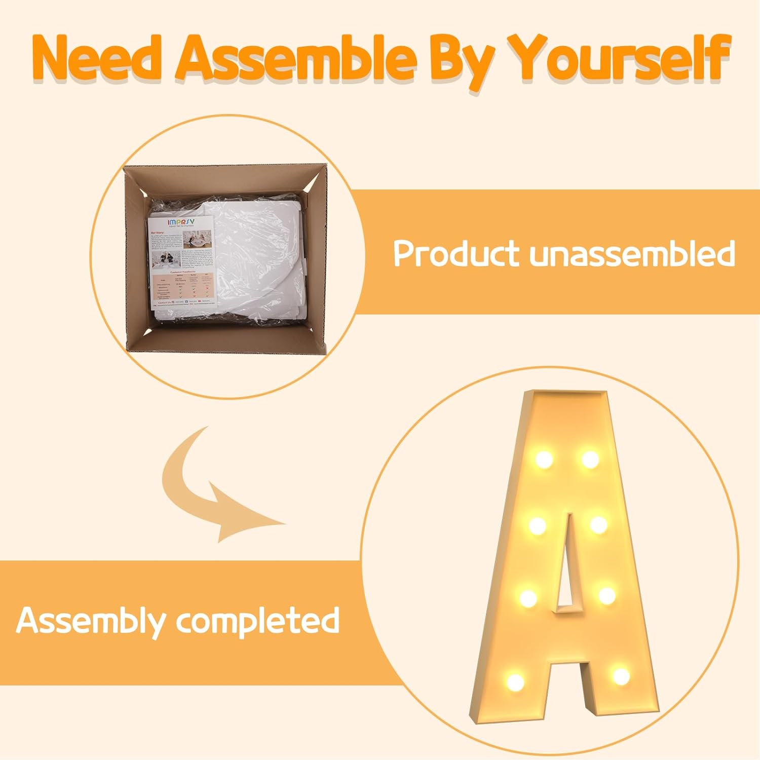 - Assembly Required: Our large marquee letters is made from foam board and easy to assemble with our splicing mode. Just follow the numbered instructions to align and insert the bottom plate, and reinforce it with a hot glue gun. Then, you're done!