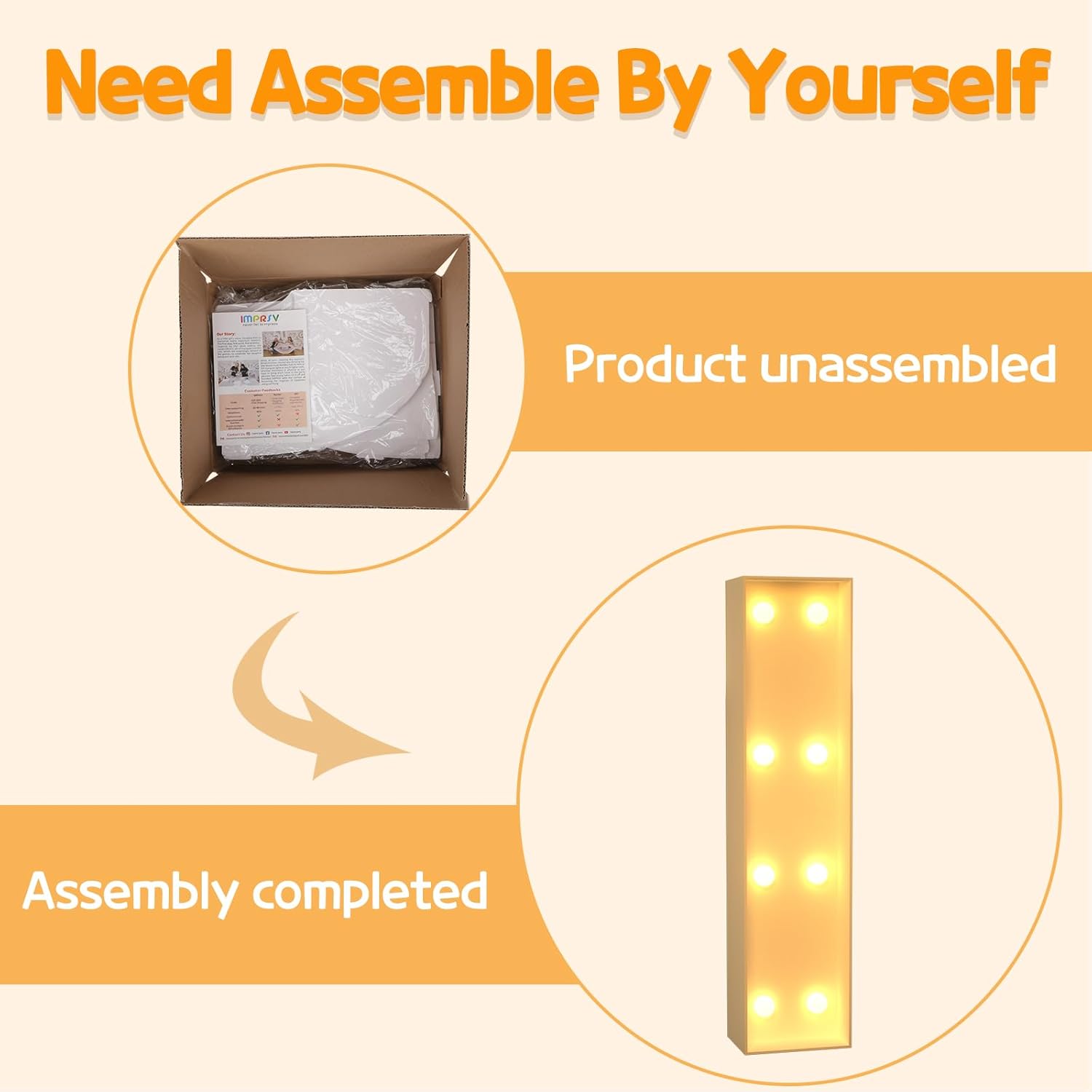 - Assembly Required: Our large marquee letters is made from foam board and easy to assemble with our splicing mode. Just follow the numbered instructions to align and insert the bottom plate, and reinforce it with a hot glue gun. Then, you're done!