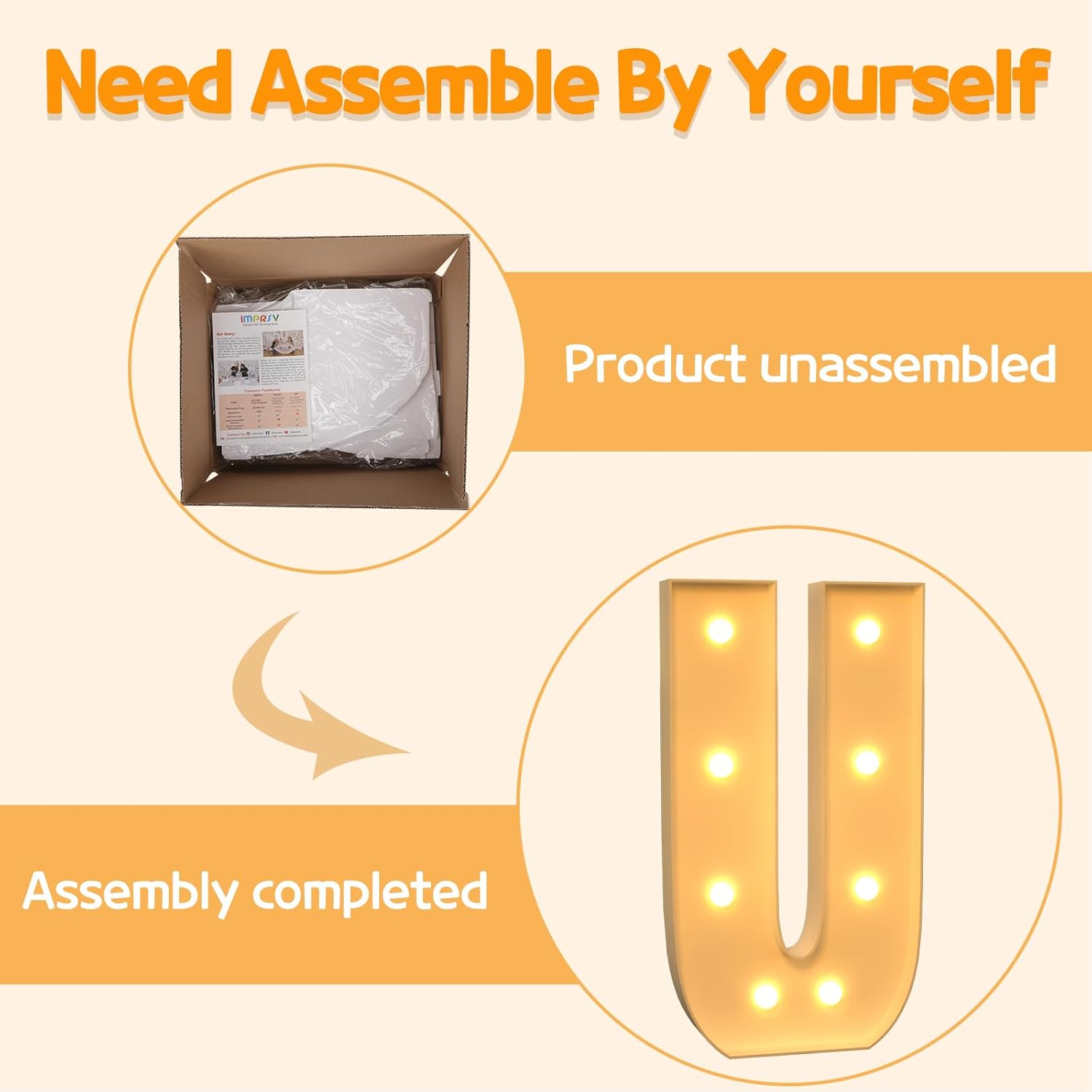 - Assembly Required: Our large marquee letters is made from foam board and easy to assemble with our splicing mode. Just follow the numbered instructions to align and insert the bottom plate, and reinforce it with a hot glue gun. Then, you're done!