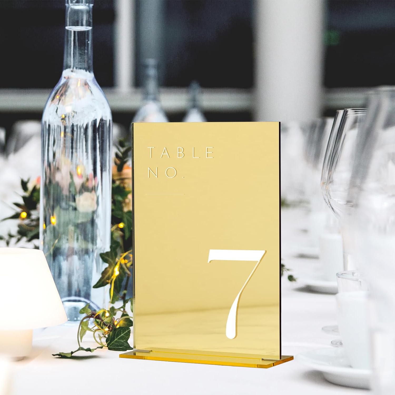 - PREMIUM QUALITY: These gold acrylic table numbers with holders are made from high quality gold acrylic panels and then printed with white letters in a simple arch design that won't go out of style and will last a long time.