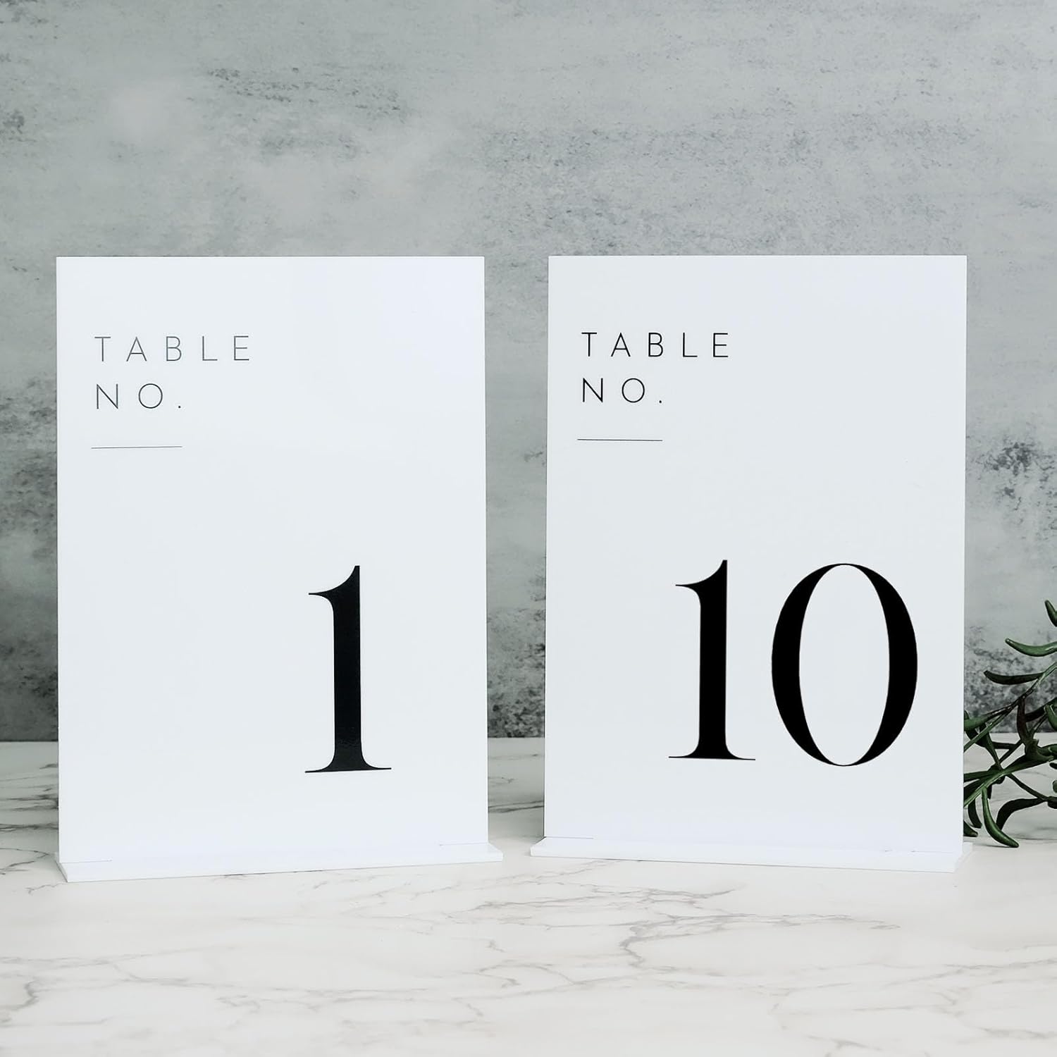 - PREMIUM QUALITY: These white acrylic table numbers with holders are made from high quality white acrylic panels and then printed with white letters in a simple arch design that won't go out of style and will last a long time.
