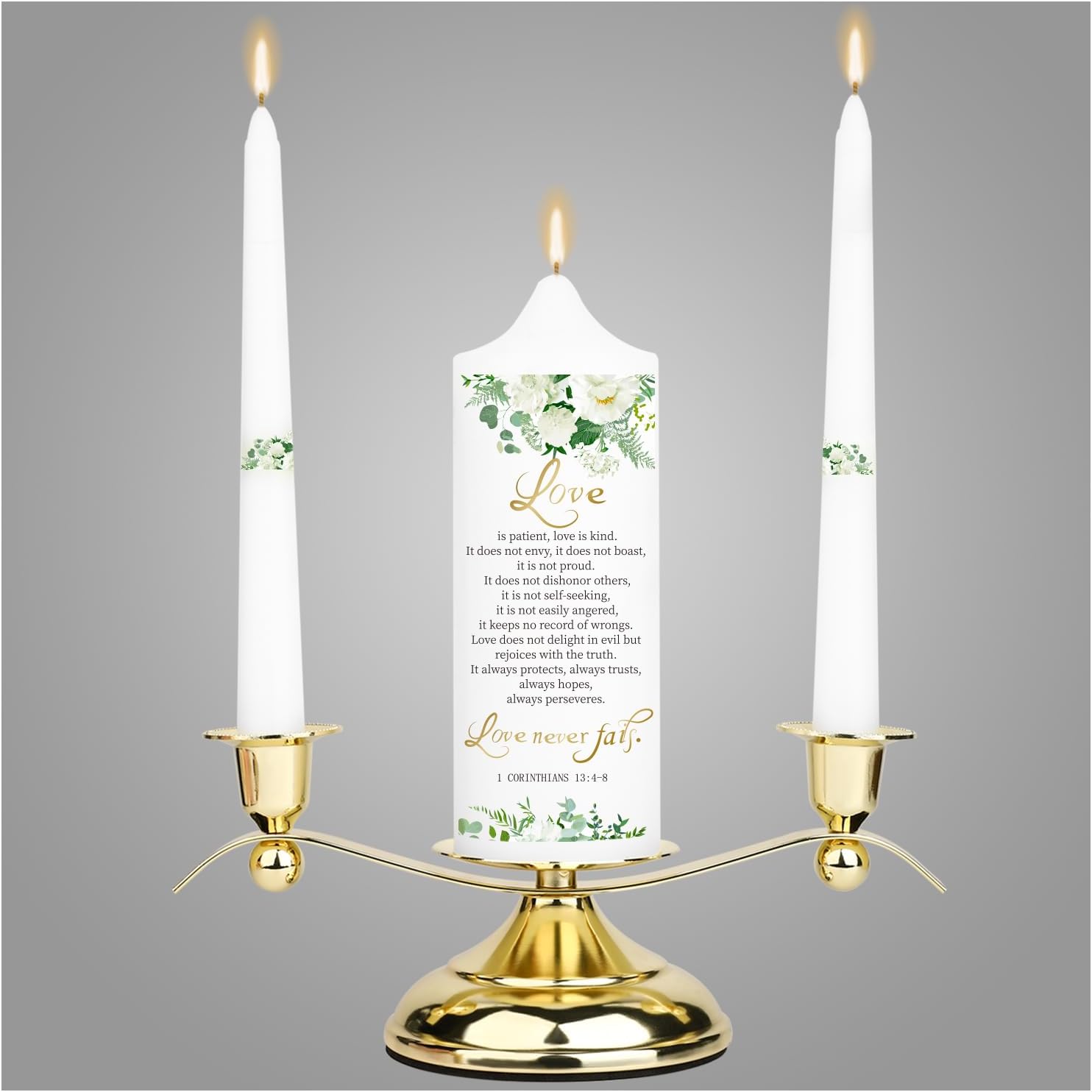 - Elegant Unity Wedding Candle Set: Finding outstanding set of wedding candles? Illuminate the wedding ceremony with this elaborate set of 3 white pillar candles. Featuring wedding flowers such as cream peonies, hydrangeas, eucalyptus leaves, these tall candles exude elegance and class as wedding ceremony accessories.