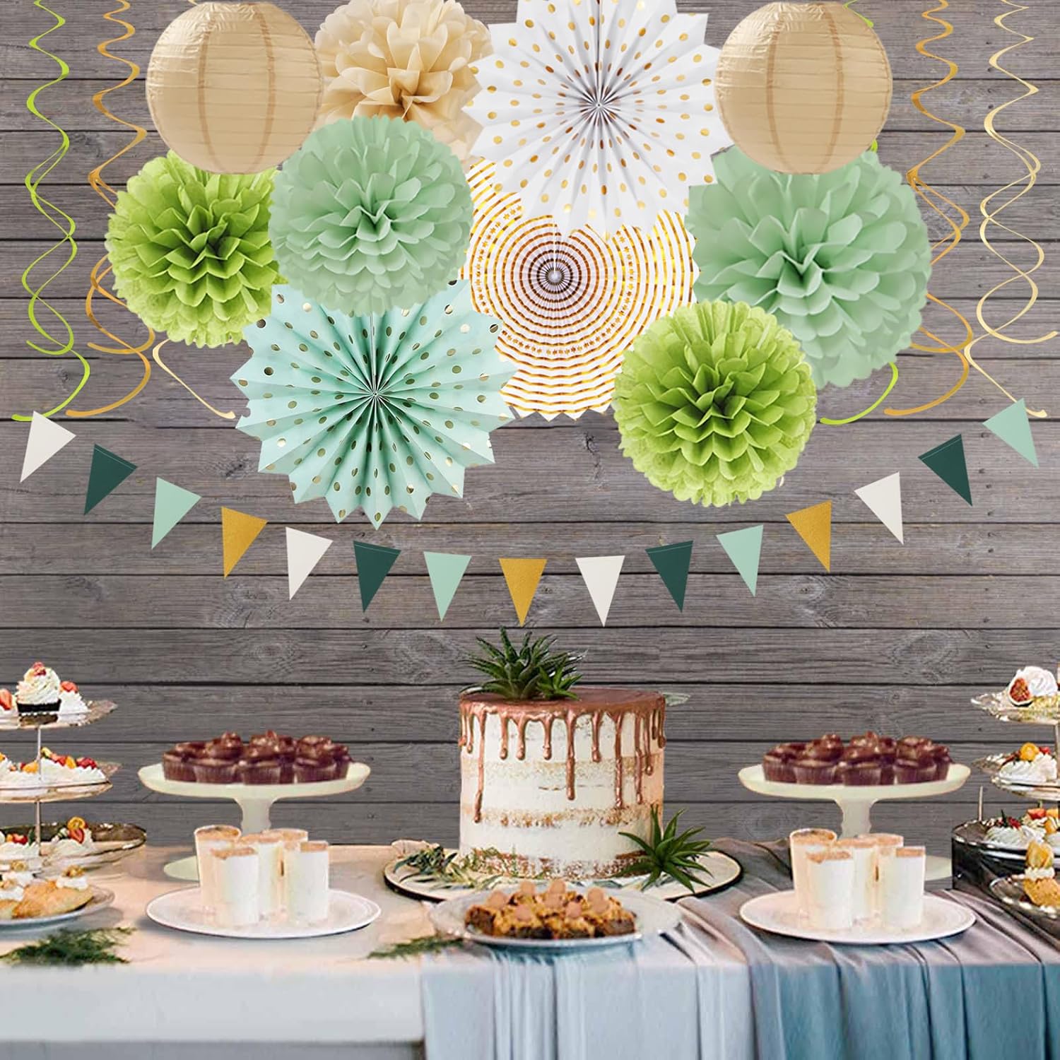- Package Including:The sagy-olive green gold brown party decorations 1pcs paper garland dots,1pcs Triangle Flags in four color,15pcs tassel garland in four color,2pcs 8"paper lantern,6pcs streamers in three color,4pcs 10"tissue pom poms in fourcolor,1pcs 12"tissue pom poms,2pcs 12"paper lantern fan in two color,1pcs 16”paper lantern fan.
