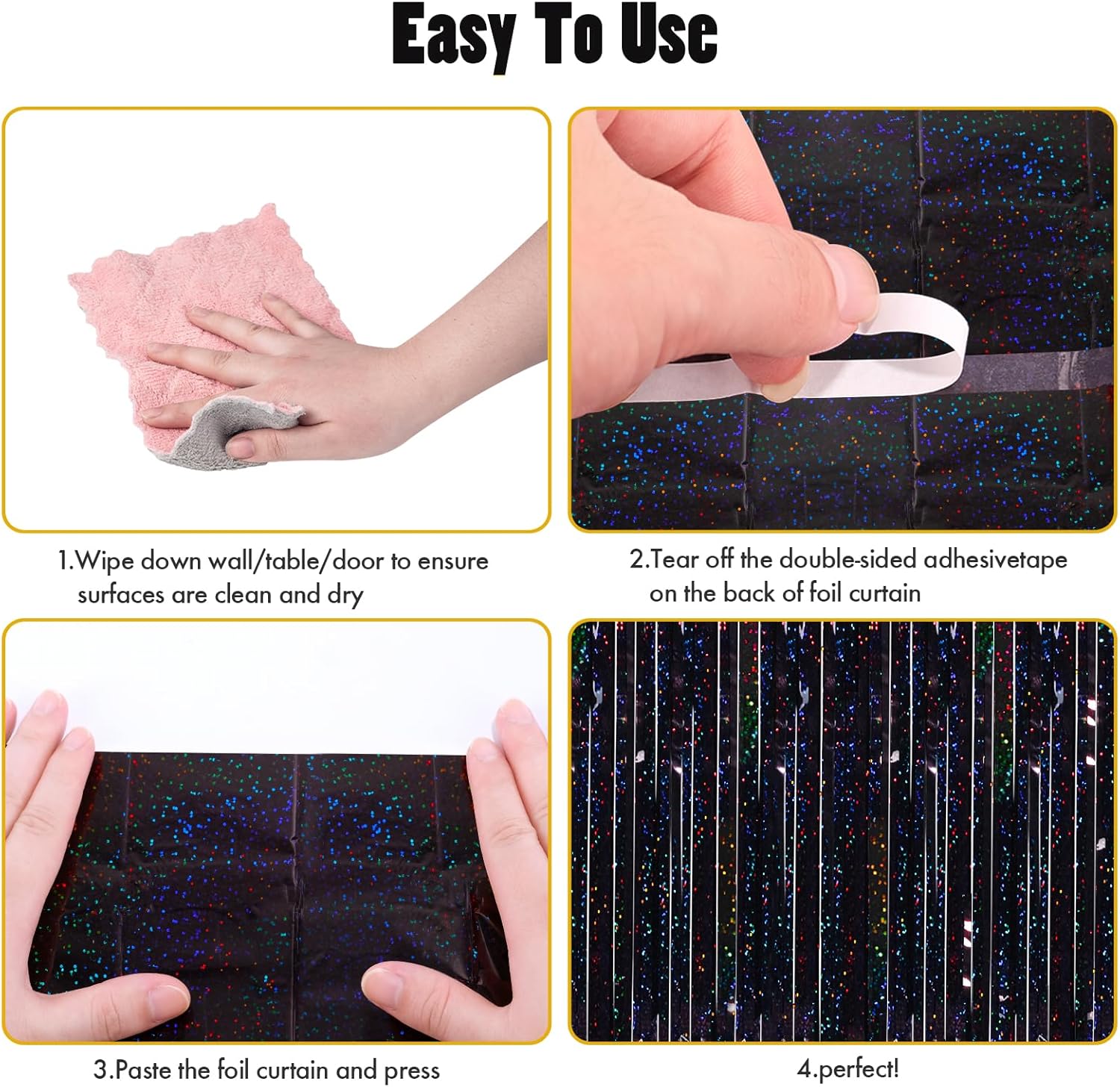 - 🎉NO HASSLE INSTALLATION - The foil curtain backdrop comes with double sided tape on the top, peel plastic strip off and it would be very easy to paste on smooth surfaces such as wall, window, table, door or anywhere you like. You can cut the foil curtain with scissors into the suitable Length, assemble the party streamers side by side to make the backdrop larger, or layer the backdrop curtains to get a thicker effect.