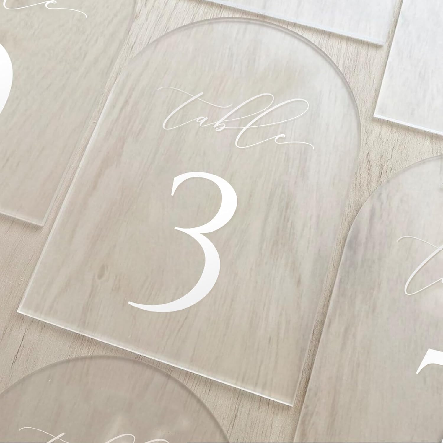 - Frosted Arch Table Numbers with Acrylic Stands: Arched acrylic is so on trend for this year's wedding decorations. These gorgeous arch acrylic wedding table numbers will look stunning on your tables and go with any wedding style, from rustic through to timeless and classic.