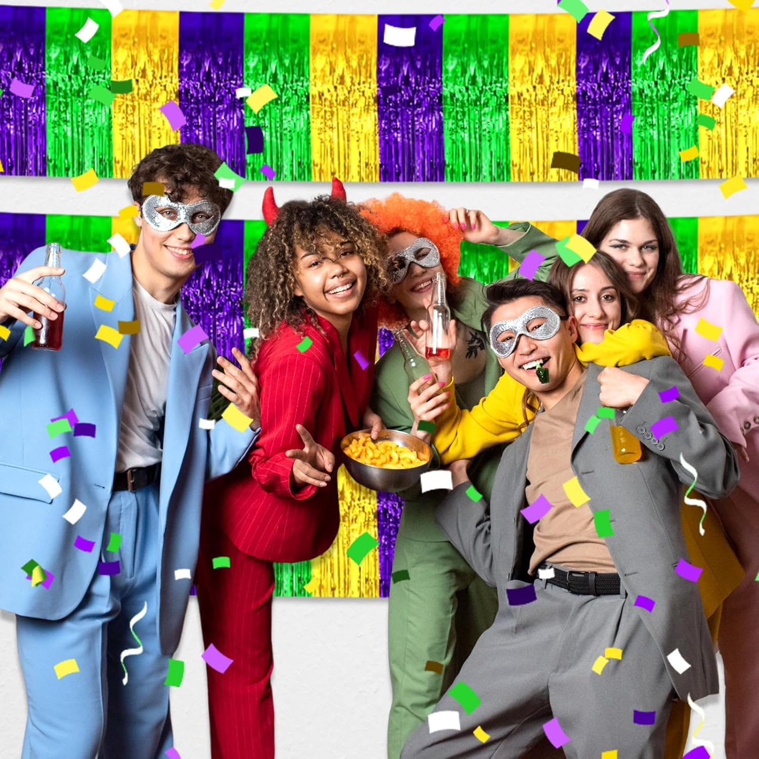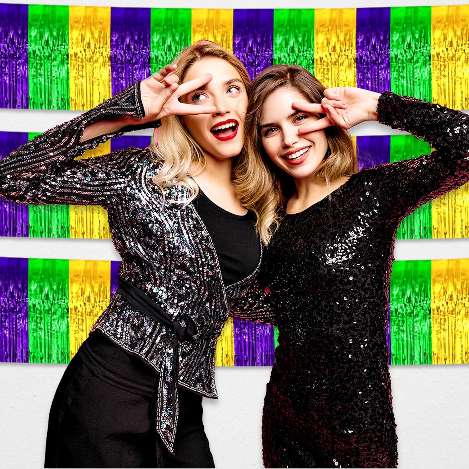 4 Pack 10 Feet Gold Green Purple Foil Fringe Garland Metallic Tinsel Streamers Banner Wall Hanging Curtain Backdrop for Parade Floats, Wedding, Graduate, Mother's Day, Birthday Party Decoration