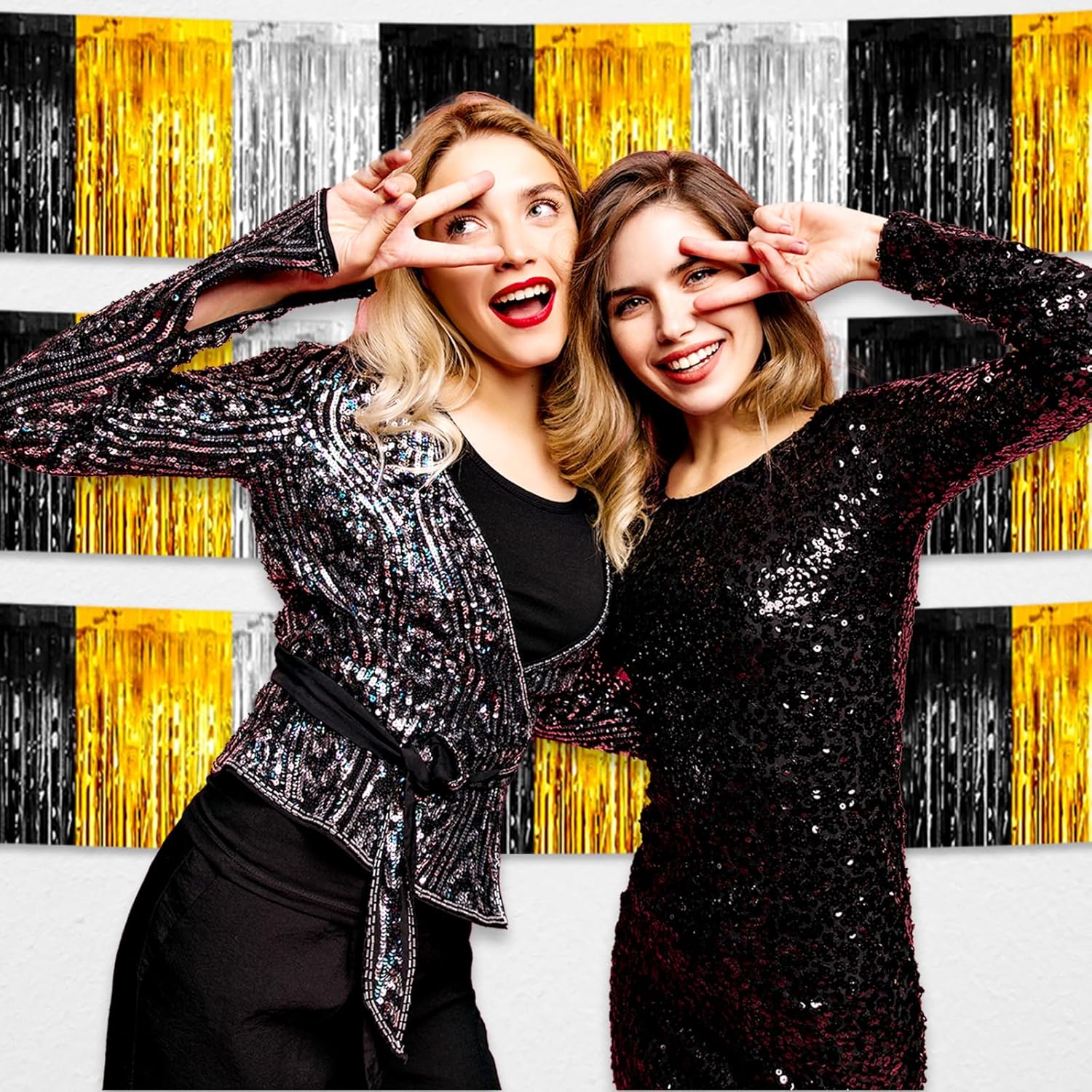 4 Pack 10 Feet Black Gold Silver Foil Fringe Garland Metallic Tinsel Streamers Banner Wall Hanging Curtain Backdrop for Parade Floats, Wedding, Graduate, Mother's Day, Birthday Party Decoration