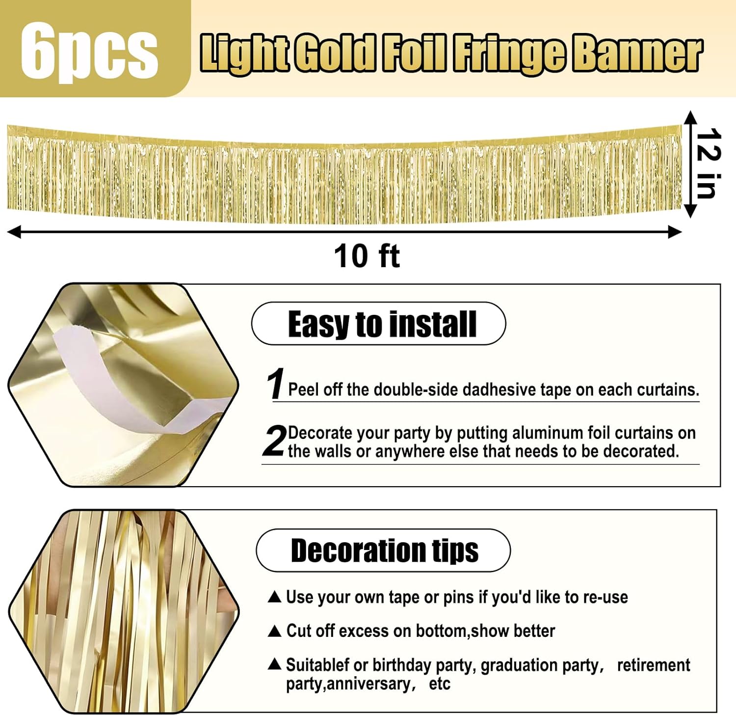 6 Pack 10 Feet Light Gold Foil Fringe Garland Metallic Tinsel Streamers Banner Wall Hanging Curtain Backdrop for Parade Floats, Birthday, Graduate, Mother's Day, Wedding Party Decoration