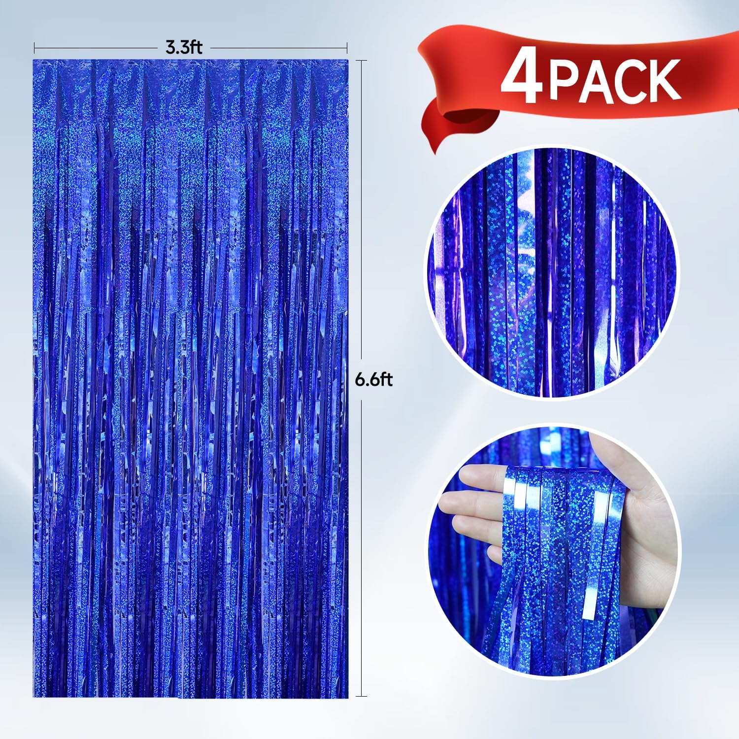 QRabbit 4 Pack Backdrop Curtains, Blue Foil Fringe Curtain Tinsel Backdrop, Party Streamers for Birthday Graduation Engagement Wedding Baby Shower Christmas Party Decorations