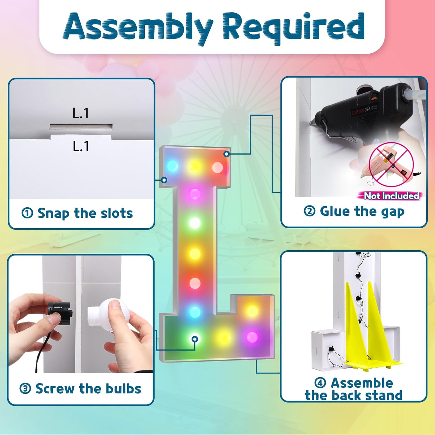 - Assembly Required. To assemble the light up numbers and letters, a hot glue gun is necessary. We have conveniently pre-cut the numbers into several pieces for your convenience. Simply consult the included instruction manual to easily assemble the impressive 4 ft tall and 3ft tall marquee numbers and letters using a hot glue gun.