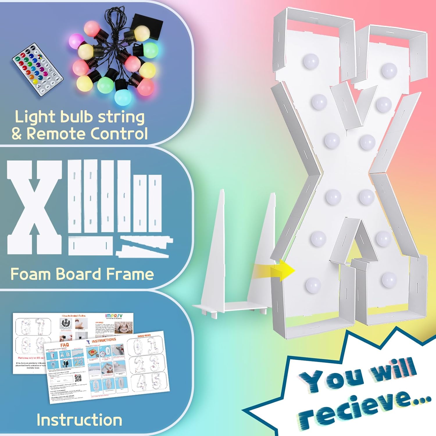 imprsv 4FT Colorful Marquee Light Up Letters X, 18 Colors Large Light up Letters Alphabet Sign with Remote, Large Marry Me Sign, Birthday Party Decorations Baby Shower Anniversary Wedding Decoration