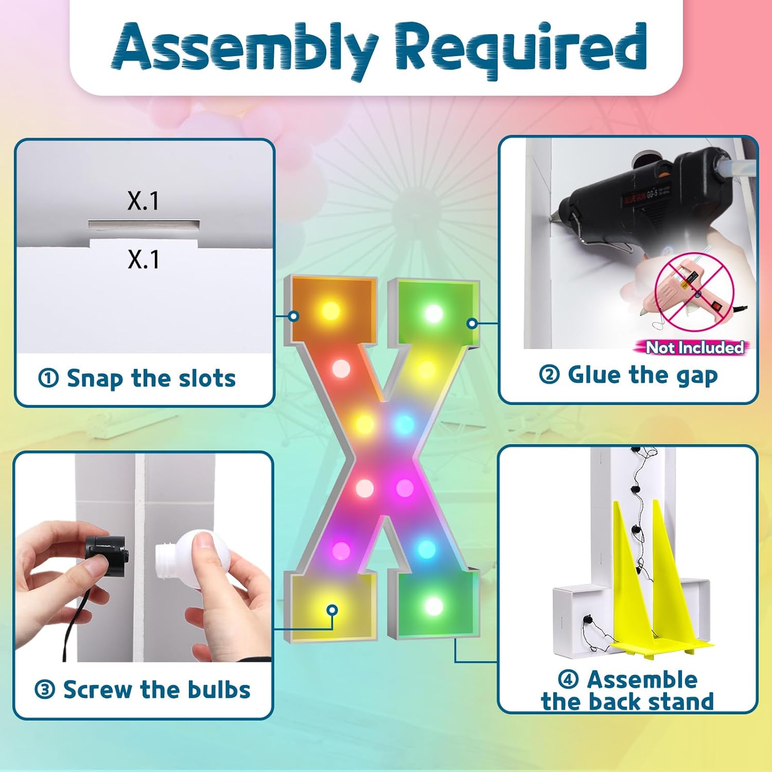 - Assembly Required. To assemble the light up numbers and letters, a hot glue gun is necessary. We have conveniently pre-cut the numbers into several pieces for your convenience. Simply consult the included instruction manual to easily assemble the impressive 4 ft tall and 3ft tall marquee numbers and letters using a hot glue gun.