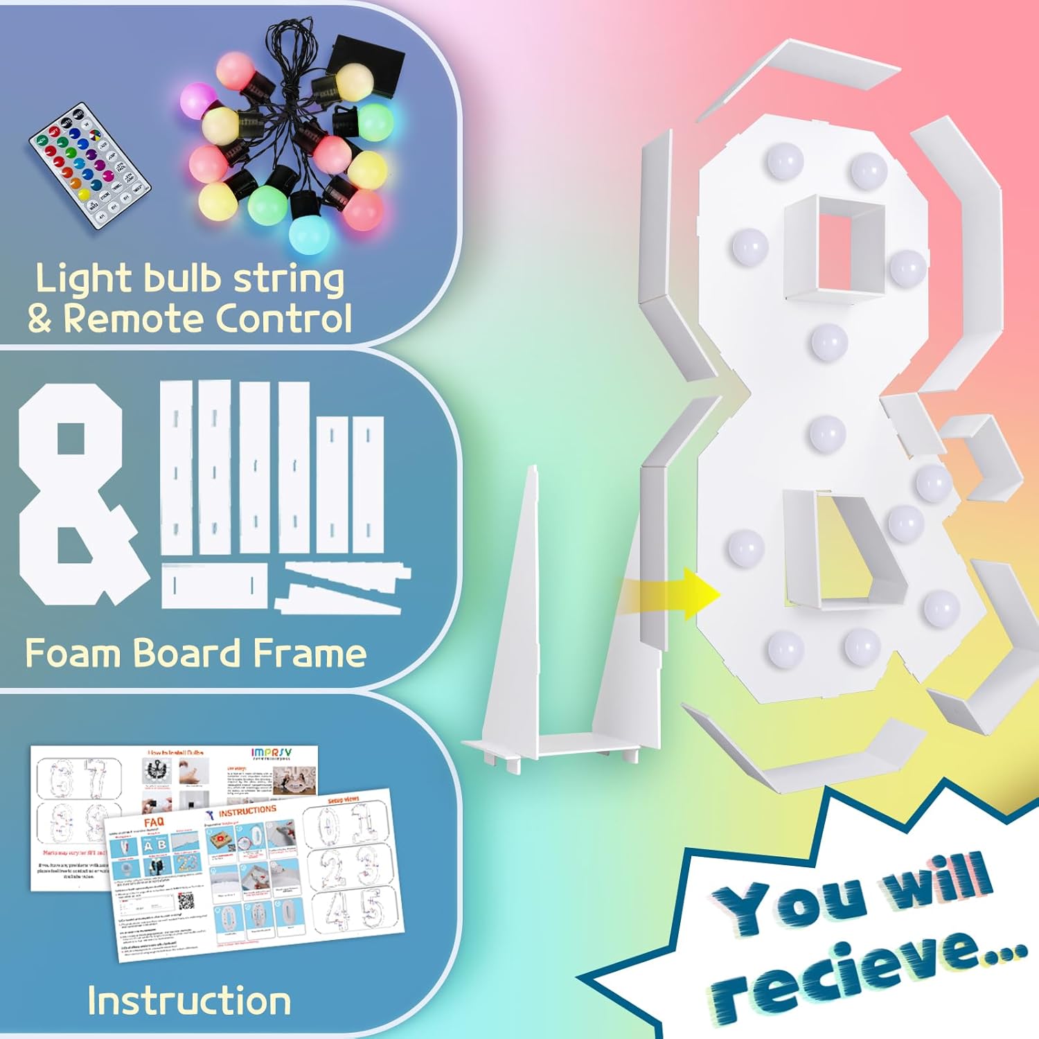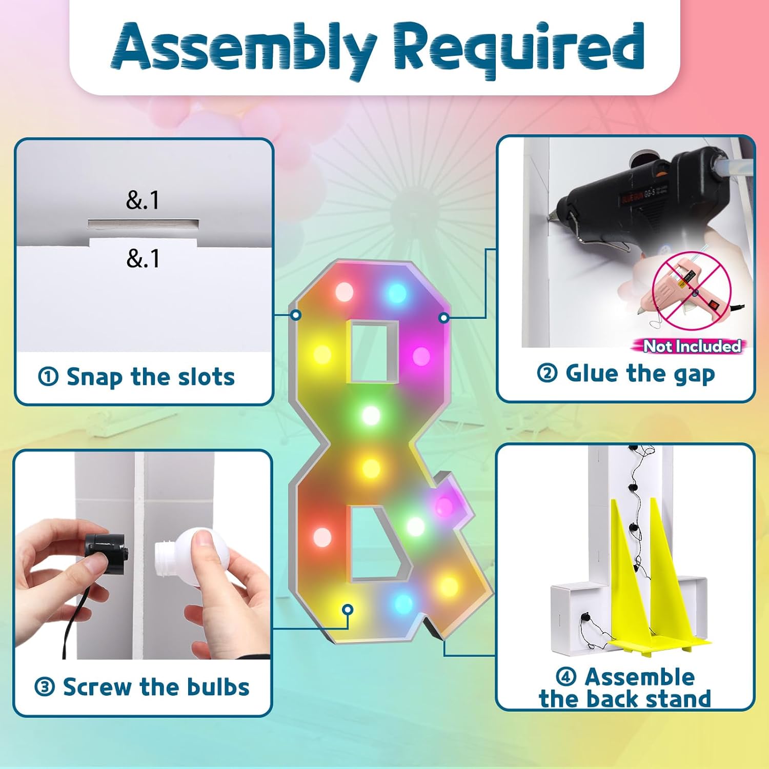 - Assembly Required. To assemble the light up numbers and letters, a hot glue gun is necessary. We have conveniently pre-cut the numbers into several pieces for your convenience. Simply consult the included instruction manual to easily assemble the impressive 4 ft tall and 3ft tall marquee numbers and letters using a hot glue gun.