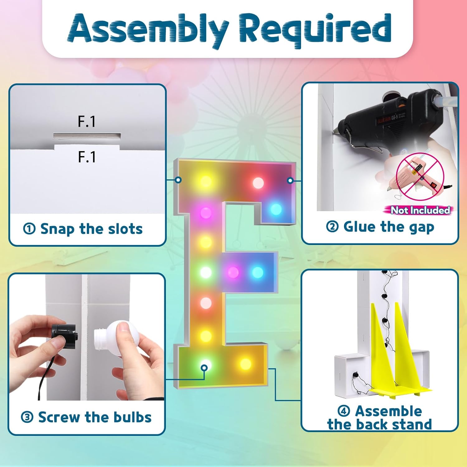 - Assembly Required. To assemble the light up numbers and letters, a hot glue gun is necessary. We have conveniently pre-cut the numbers into several pieces for your convenience. Simply consult the included instruction manual to easily assemble the impressive 4 ft tall and 3ft tall marquee numbers and letters using a hot glue gun.