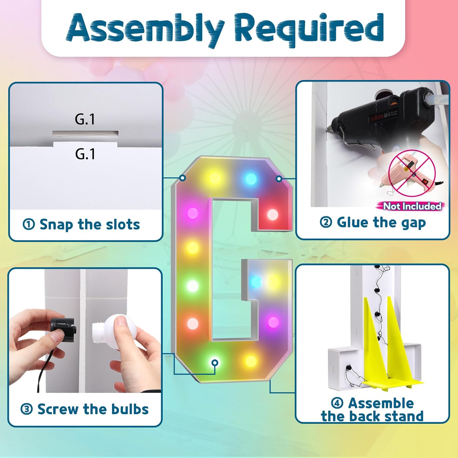 - Assembly Required. To assemble the light up numbers and letters, a hot glue gun is necessary. We have conveniently pre-cut the numbers into several pieces for your convenience. Simply consult the included instruction manual to easily assemble the impressive 4 ft tall and 3ft tall marquee numbers and letters using a hot glue gun.