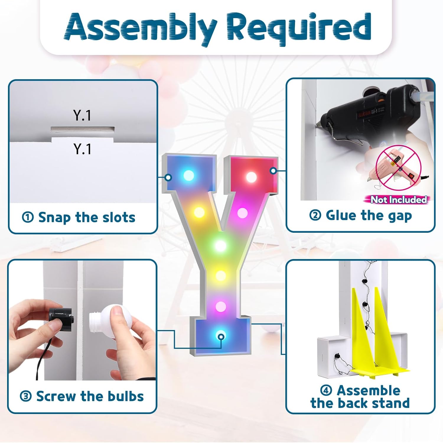 - Assembly Required. To assemble the light up numbers and letters, a hot glue gun is necessary. We have conveniently pre-cut the numbers into several pieces for your convenience. Simply consult the included instruction manual to easily assemble the impressive 4 ft tall and 3ft tall marquee numbers and letters using a hot glue gun.