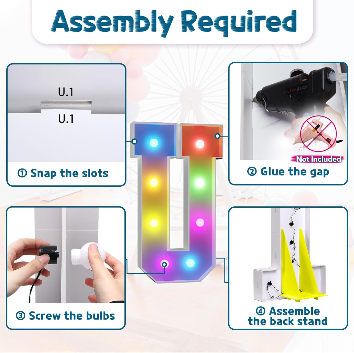 - Assembly Required. To assemble the light up numbers and letters, a hot glue gun is necessary. We have conveniently pre-cut the numbers into several pieces for your convenience. Simply consult the included instruction manual to easily assemble the impressive 4 ft tall and 3ft tall marquee numbers and letters using a hot glue gun.